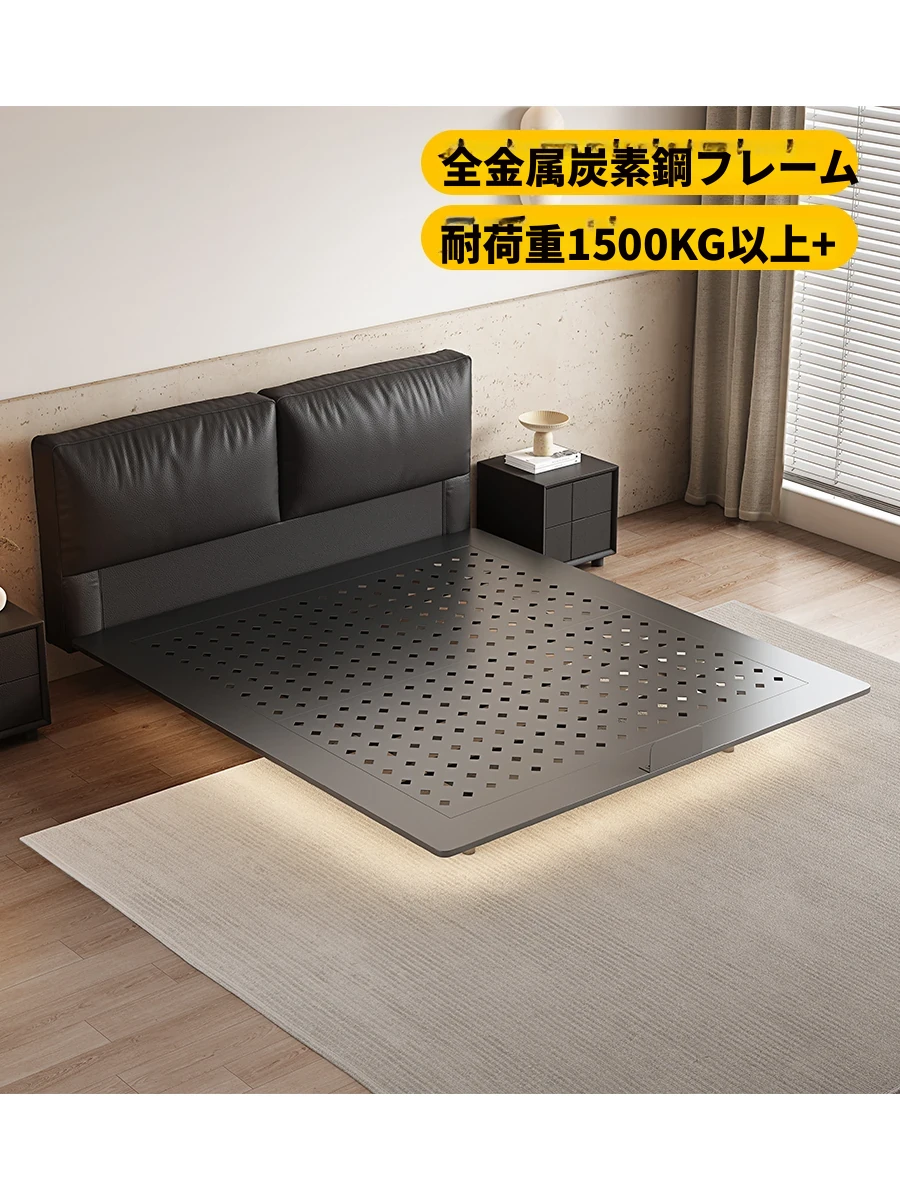 パーソン記の全カーボンスチール製ベッドフレーム、ヘッドボードなしの小型モダンレザーイタリアンミニマリストマスターベッド、浮遊デザインで空間を有効活用!