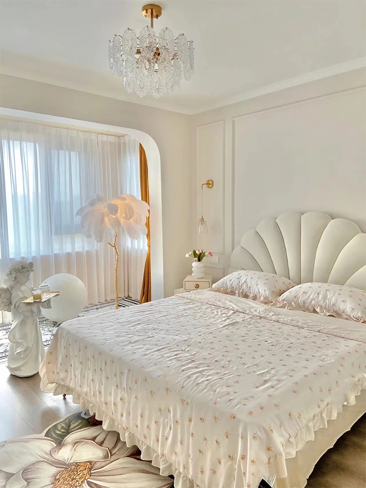 朴笙記 花びらデザインの本革ベッド - 現代的でシンプルな北欧スタイル、イタリアンミニマリズムを取り入れた落ち着きのある主寝室用ベッド。ブナ材のフラットな大きなベッドで、結婚生活に最適な一品です。