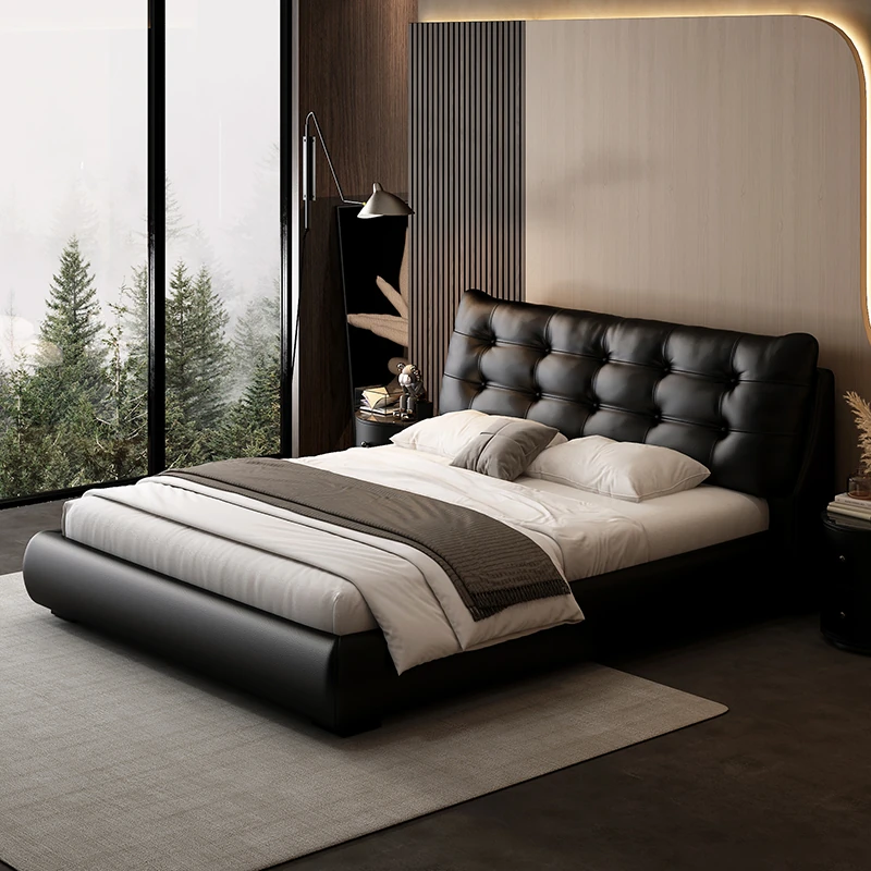 朴笙記の大黒熊本革ベッド - モダンでシンプルな北欧・イタリアンスタイルの主寝室用婚礼ベッド。軽奢なブナ材使用のダブルベッドで、快適な眠りを提供します。