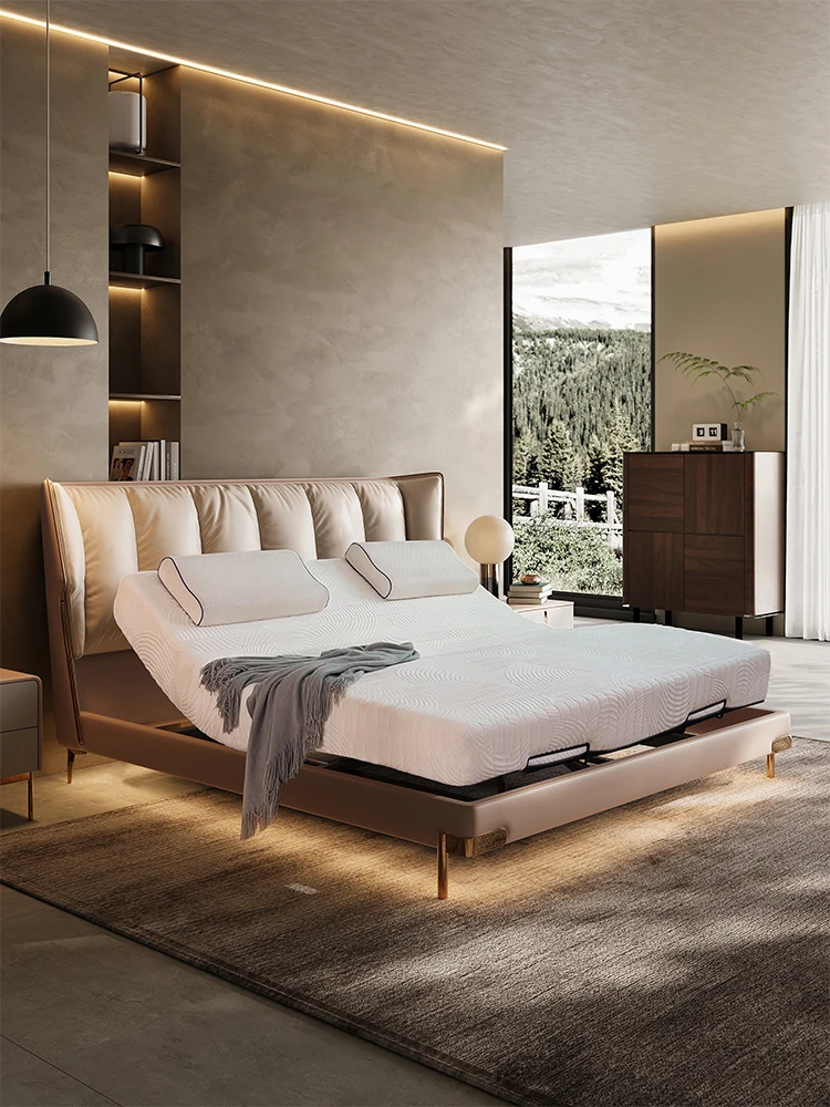 朴笙記の本革全自動スマート電動ベッドフレーム - ドイツ輸入Okinモーター搭載、マルチ機能リモコン付き!ゼロ・グラビティ体験で極上のリラックスを実現!
