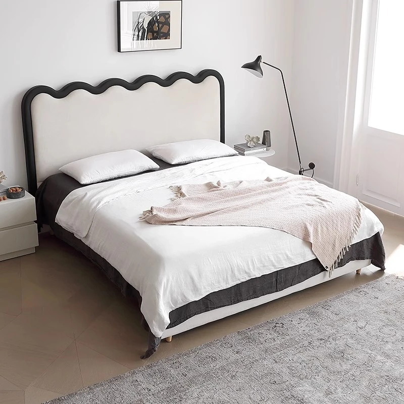 朴笙記のユニークな雲模様の四角い格子デザイン!シンプルでスタイリッシュな布製ベッド。小型住居にも最適なダブルベッド。美しいブナ材を使用したデザイナーズベッドで、広々とした空間を演出します。