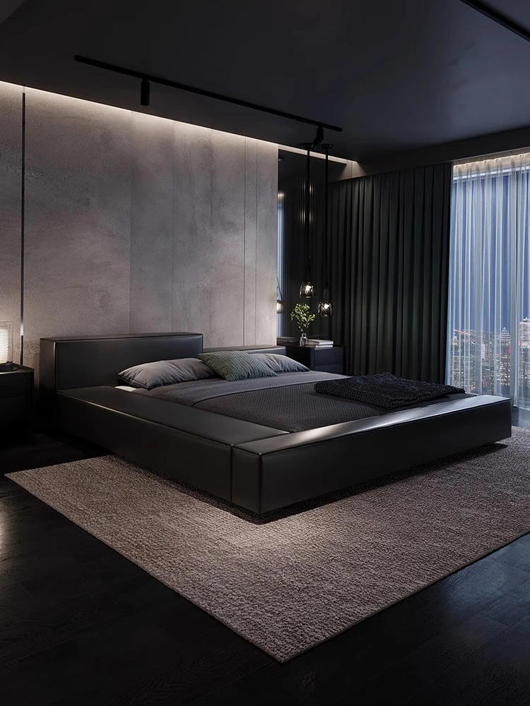 朴笙記の超薄型本革ベッド - モダンでシンプルな北欧・イタリアンスタイルの主寝室用結婚ベッド。浮遊感のあるビーチウッド製の黒い大床で、心地よい睡眠をお届けします。