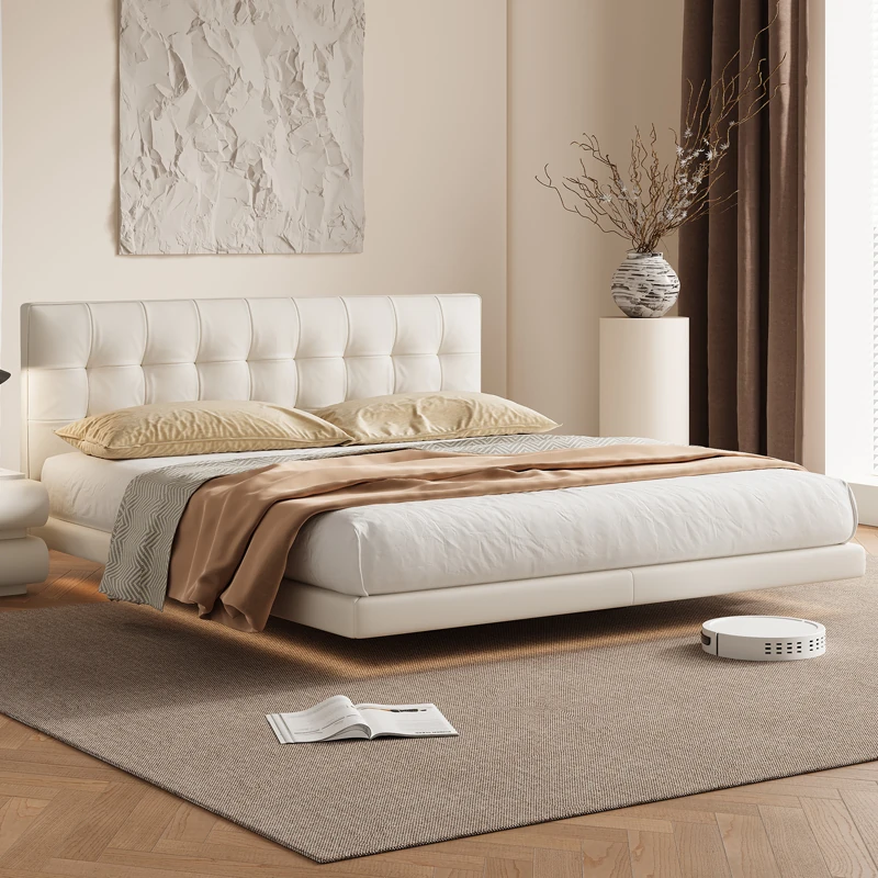パーソン記鉄製超薄豆腐ブロックバウハウスクリーム本革ベッドカーボンスチール浮遊型小型住宅用セカンドベッド婚礼用ベッド