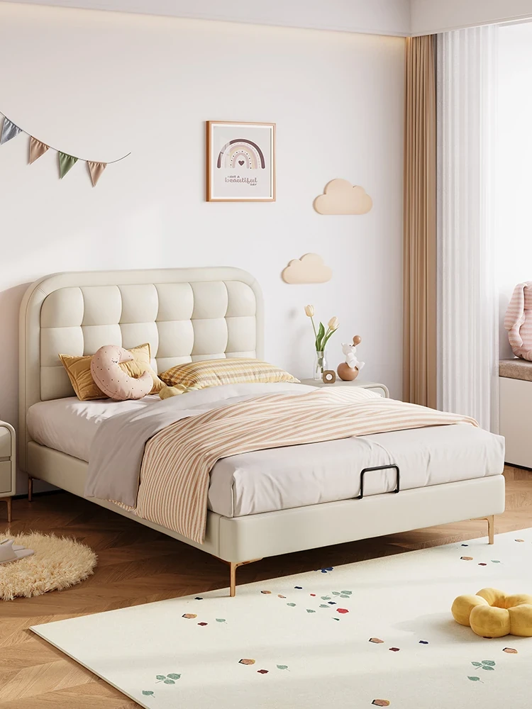 クリームホワイトの本革収納付き子供用ワッフルベッド - シンプルでモダンなデザイン、男の子も女の子も喜ぶシングルベッド!お部屋をスタイリッシュに彩る収納力抜群の一台です。
