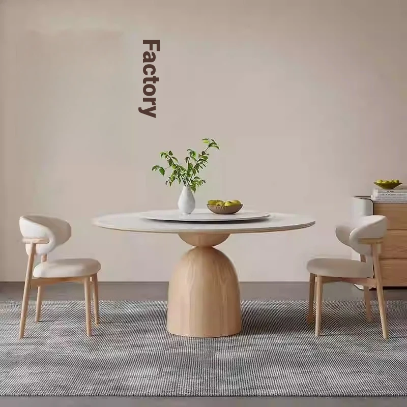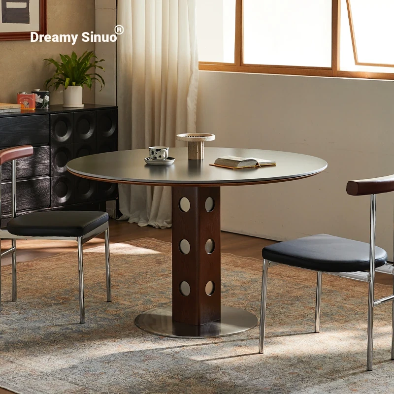 Nordic Vintage Solid Wood Round Dining Table - High-End Italian White Stone Top - Luxurious and Stylish Home Round Table for Elegant Dining Experiences