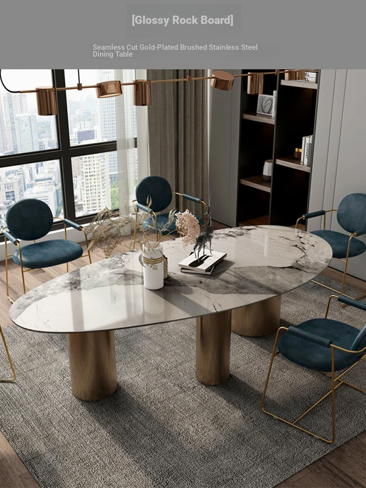 Italian Luxury Stainless Steel Imported Rock Plate Dining Table - Modern Oval Design for Villas and Homes, Perfect for Stylish Dining Experiences