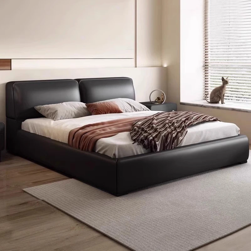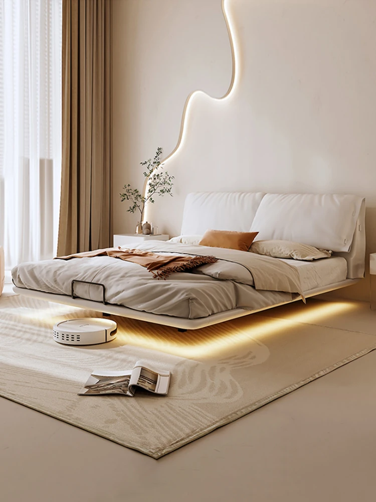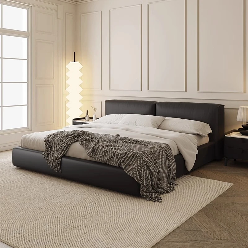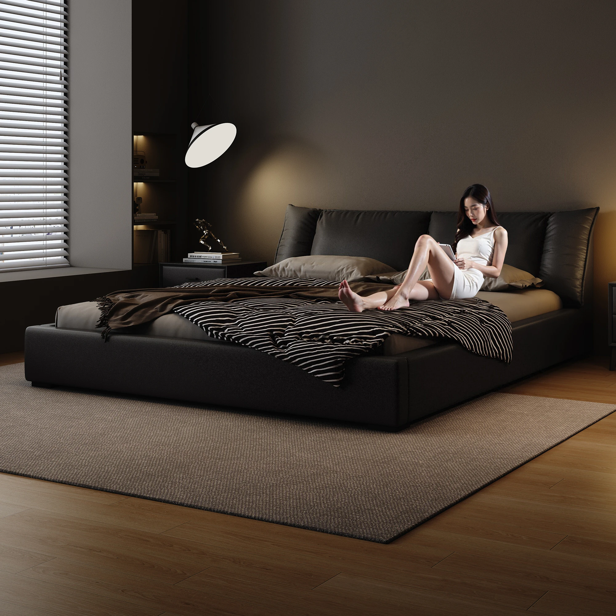 PUSHENGJI Cloud Bed - Modern Minimalist Genuine Leather Bed in Creamy Italian Style for Master Bedroom, Elegant Double Bed with Floor Design, Perfect for Newlyweds