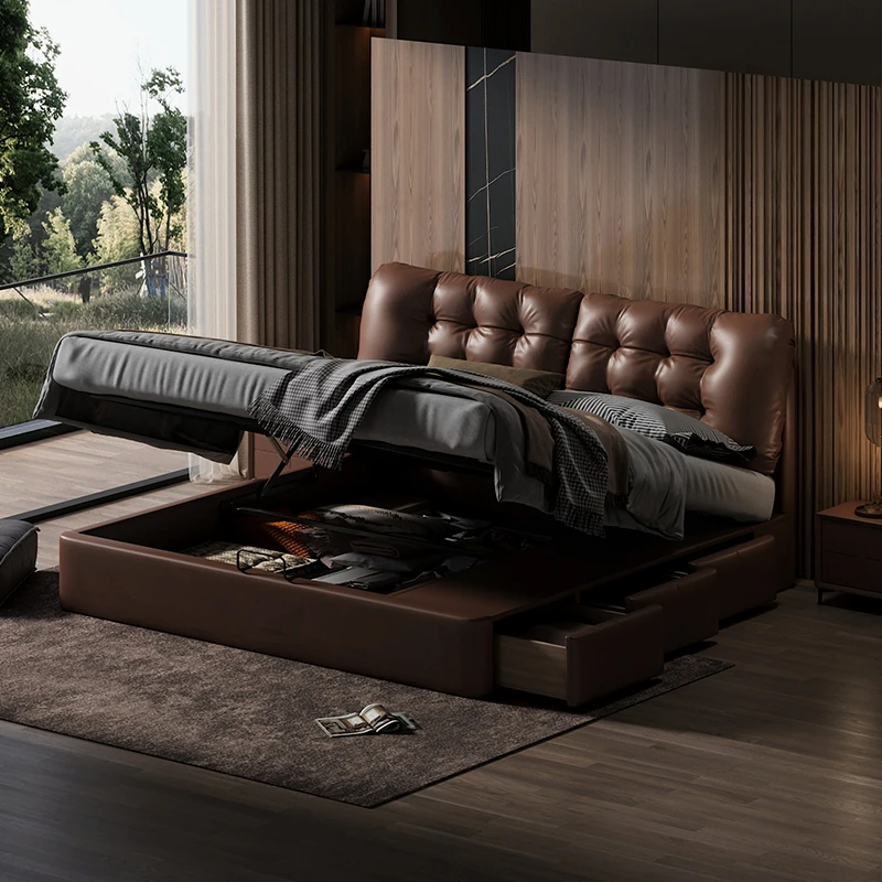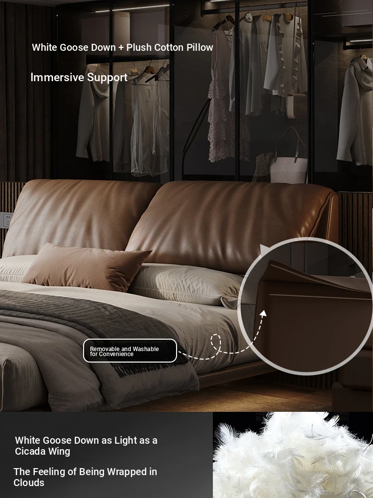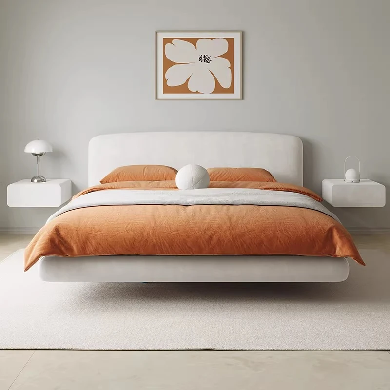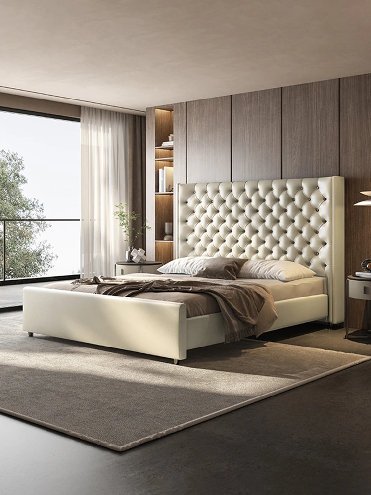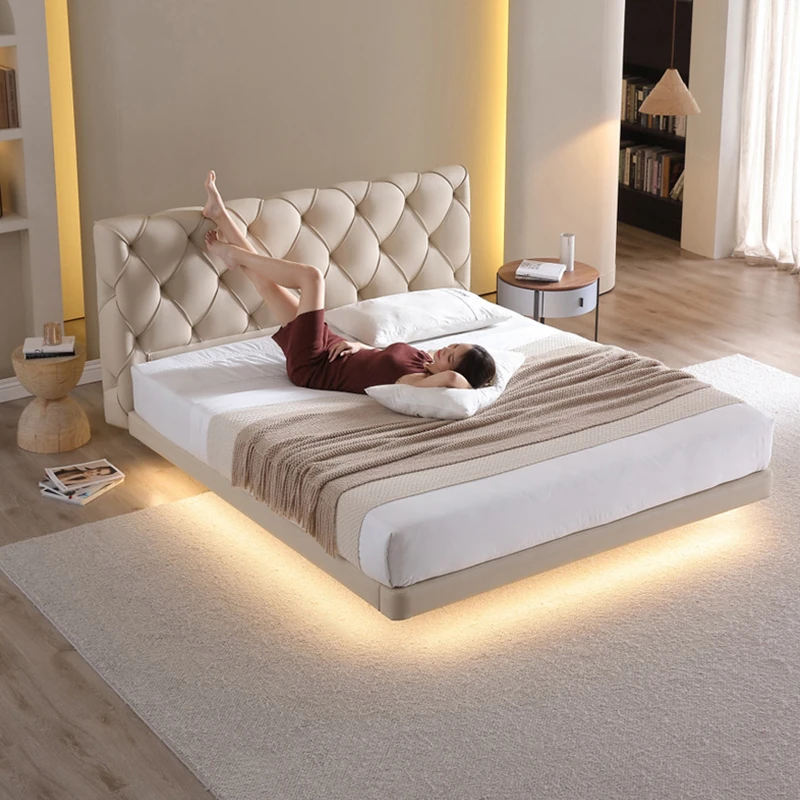 PUSHENGJI Cloud Bed - Modern Minimalist Genuine Leather Bed in Creamy Italian Style for Master Bedroom, Elegant Double Bed with Floor Design, Perfect for Newlyweds