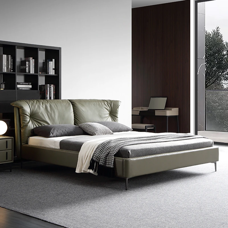 PUSHENGJI Genuine Leather Bed - Modern Minimalist Duck Down Soft Package in Dark Green, Italian Style, Ideal for Master Bedroom, Double Size Floor-standing Wedding Bed
