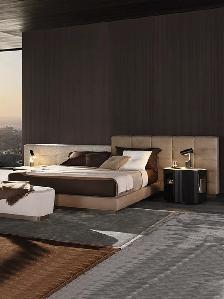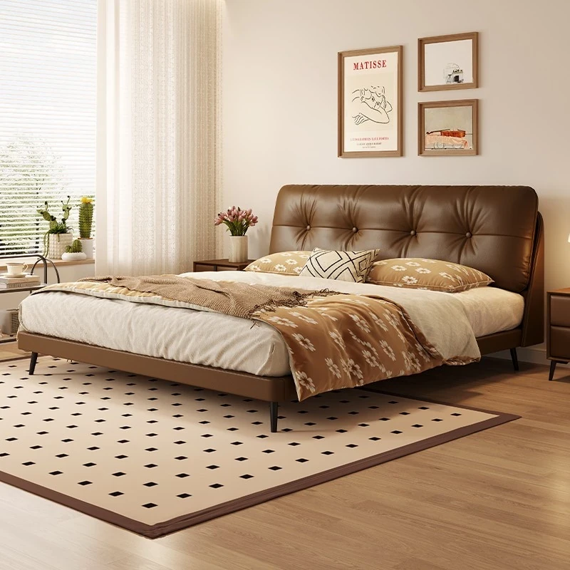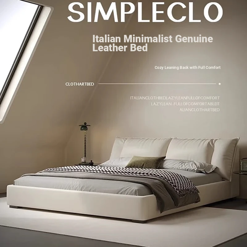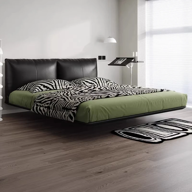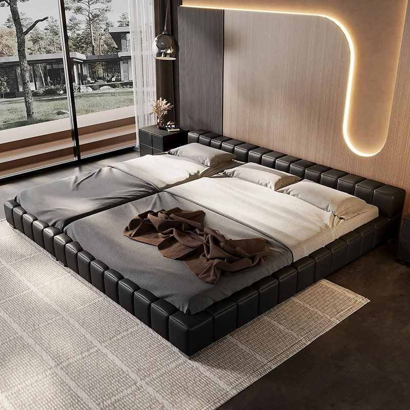 Purshang Italian Minimalist Genuine Leather Floor Bed - Modern Simple Design, Trendy Double Bed for Master Bedroom, Plush Upholstered Wedding Bed