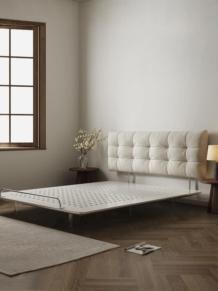 Bauhaus Style Ultra-Thin Iron Frame Cream Leather Bed with Carbon Steel Suspension - Perfect for Small Bedrooms and Modern Couples