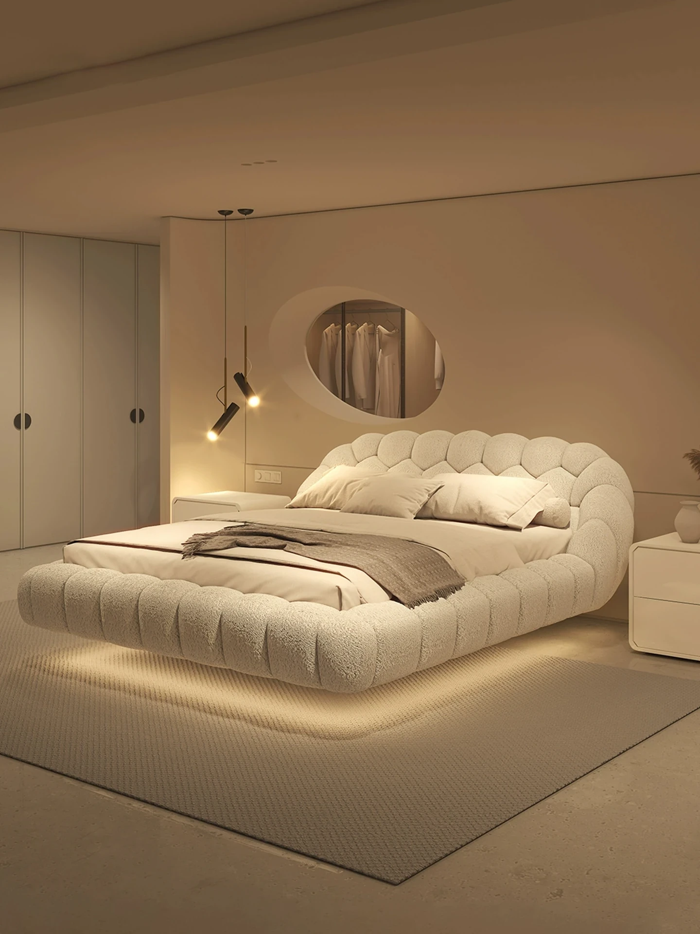 Pusheji Bubble Lamb Fleece Plush Bed - Minimalist Cream Fabric Design for Luxury Villas - Scandinavian Style Double Bed, Perfect for Cozy Comfort