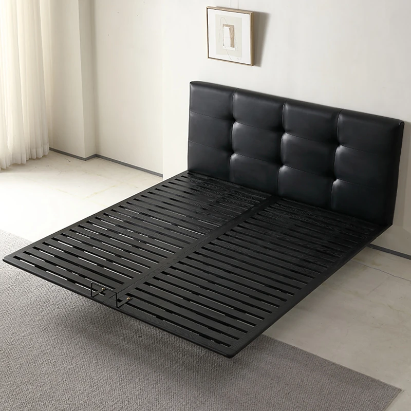 Pursangji Black Cow Genuine Leather Bed - Modern Minimalist Nordic Italian Style - Elegant Block Design for Master Bedroom - Beech Wood King Size Marriage Bed