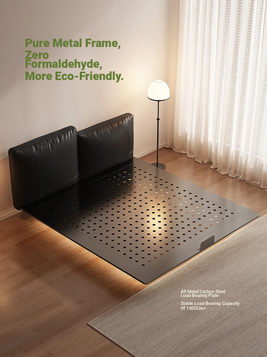 PUSHENG Premium Genuine Leather Floating Bed - Minimalist Modern Design, King Size for Master Bedroom, Luxurious Top-Grain Cowhide with LED Lights, Perfect for Newlyweds