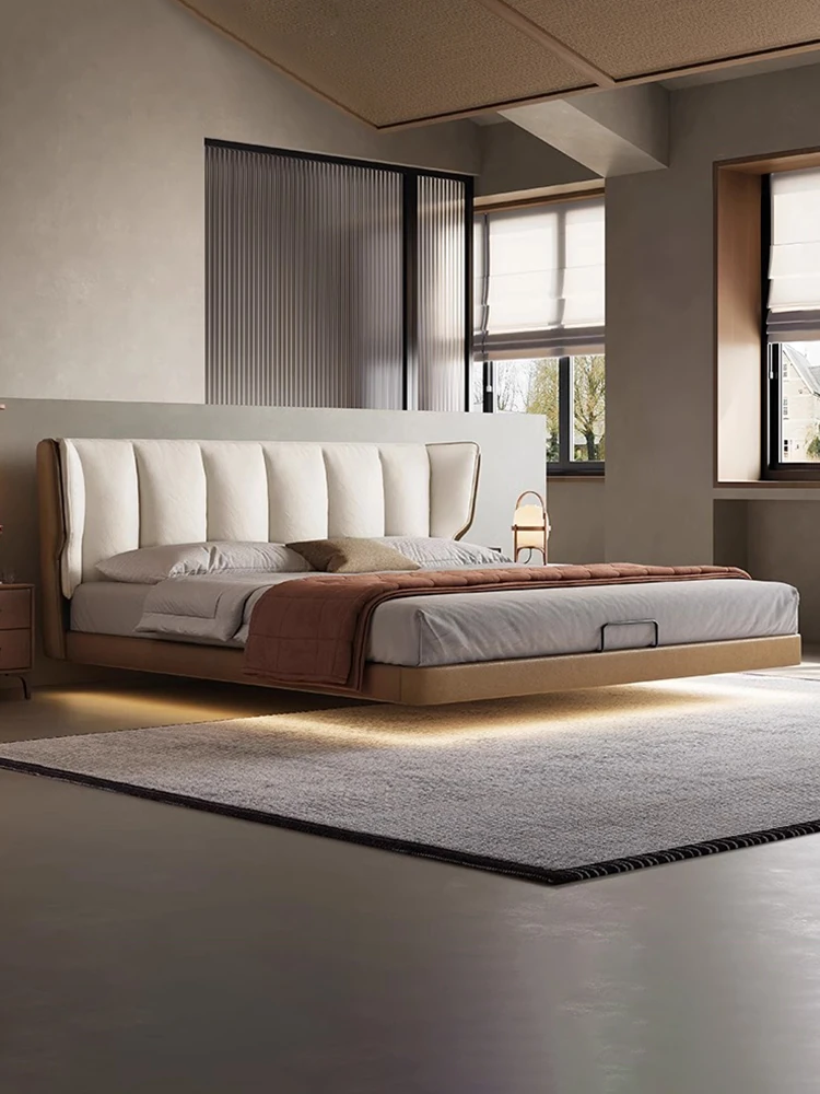 PUSHENGJI Luxury Leather Floating Bed in White Wax Wood - Modern Minimalist Design for Master Bedroom, Elegant and High-End Italian Style