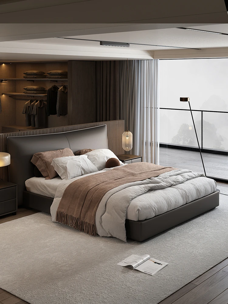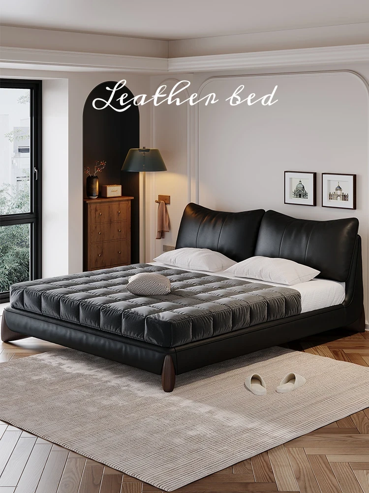 PUSHENG JI Genuine Leather Bed - Minimalist Modern Double Bed with Soft Headboard, Elegant High-End Design for Master Bedroom, Perfect for Small Spaces