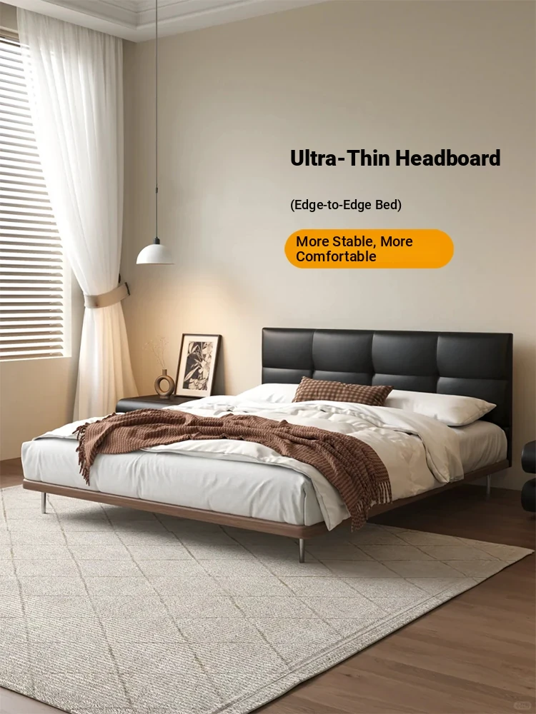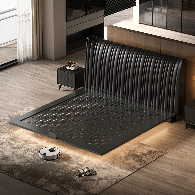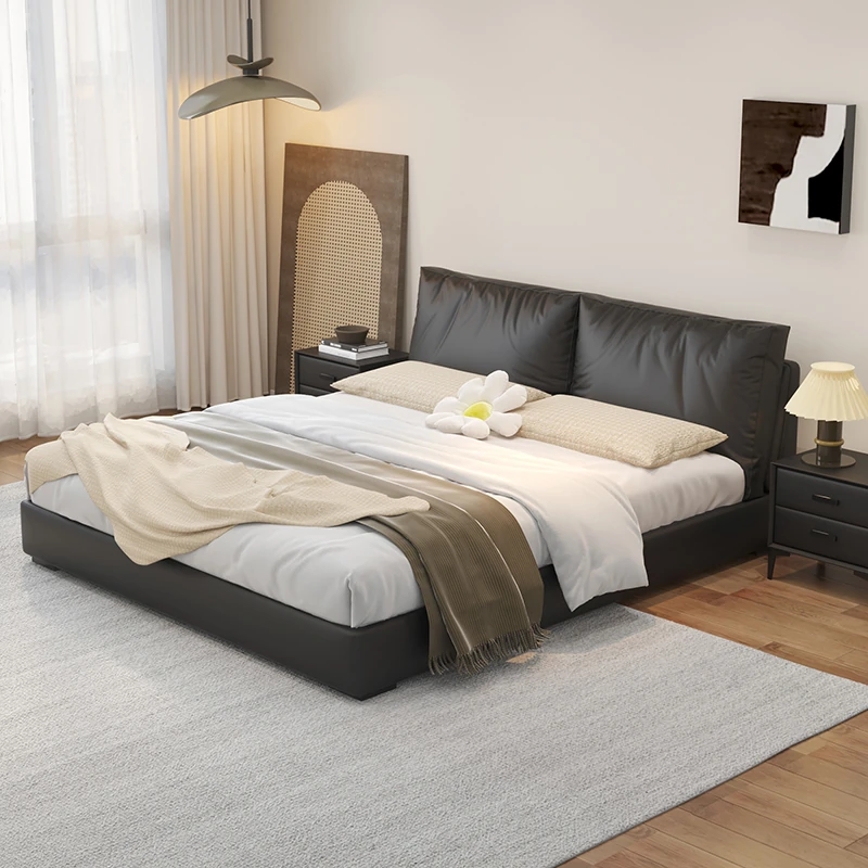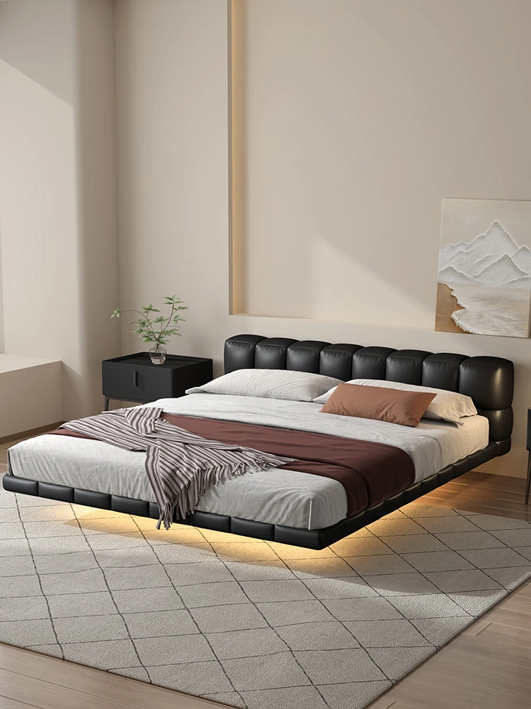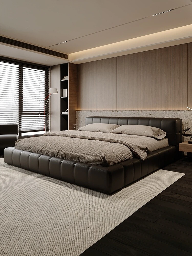 PUSHENGJI Genuine Leather Bed with Soft Padding – Modern Minimalist Italian Design for Master Bedroom, Black Floor Bed for Couples, Perfect for Newlyweds