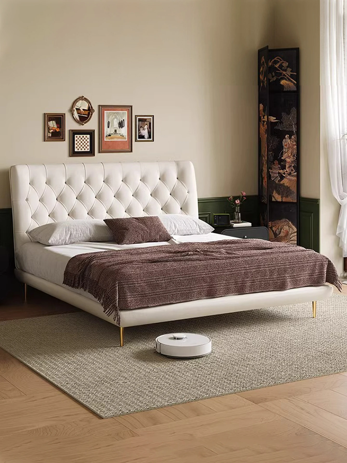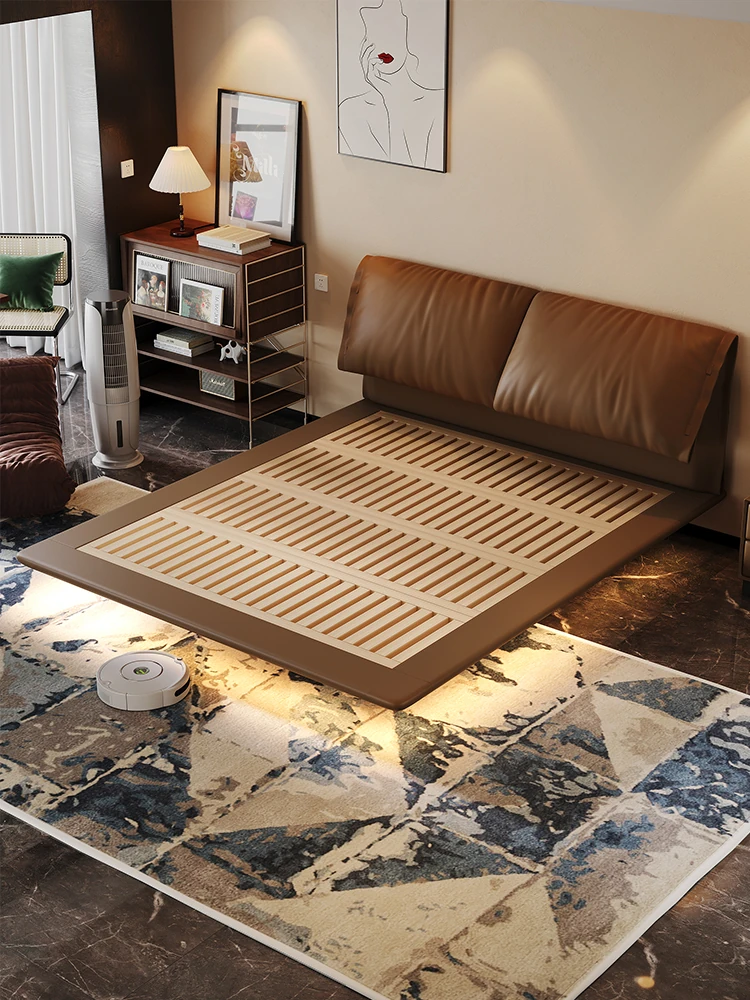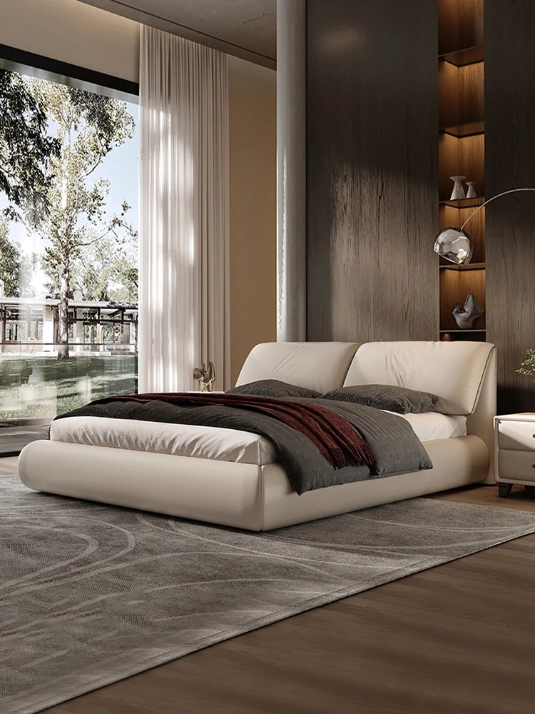 Pure Sheng Ji Elephant Ear Genuine Leather Bed - Modern Minimalist Cream Style Italian Design for Master Bedroom, Double Size Floor Bed for Newlyweds