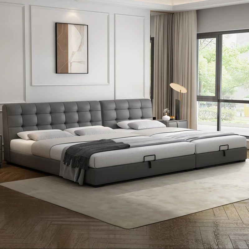 PUSHENGJI Modern Minimalist Family Bed - Stylish Grid Design for Parents and Two Kids, Spacious King Size, Versatile Tatami Style with Genuine Leather Finish for the Master Bedroom