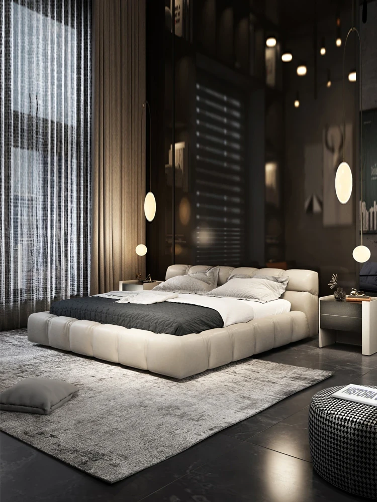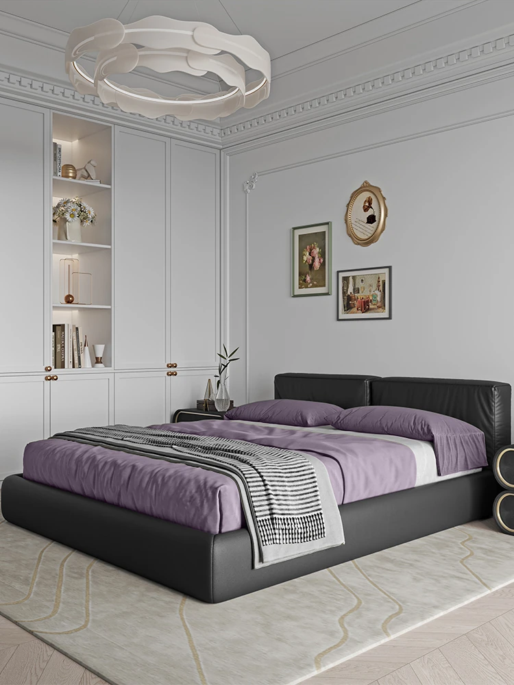 PUSENGJI Cloud Bed - Modern Minimalist Genuine Leather Bed in Creamy Italian Style, Ideal for Master Bedrooms, Elegant Floor-standing Double Bed for Couples