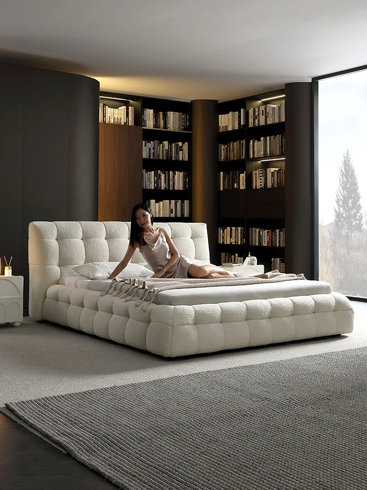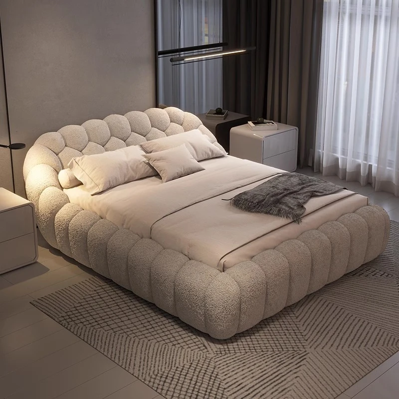 Pursangji Cozy Lamb Fleece Bed - Nordic Style Cream Fabric Double Bed for Small Spaces, Beech Wood Bread Design, Perfect for Minimalist Living