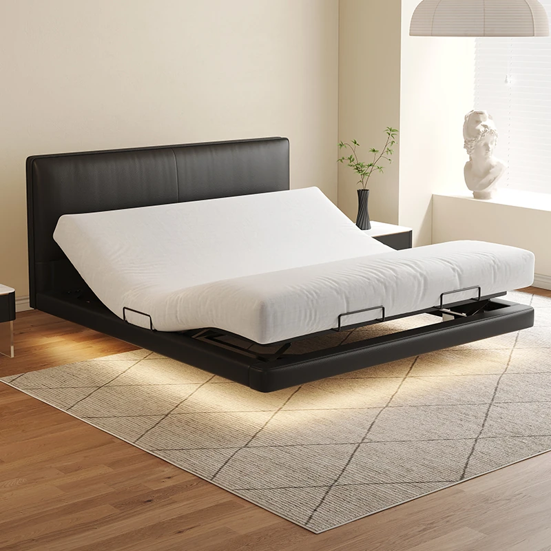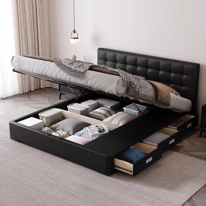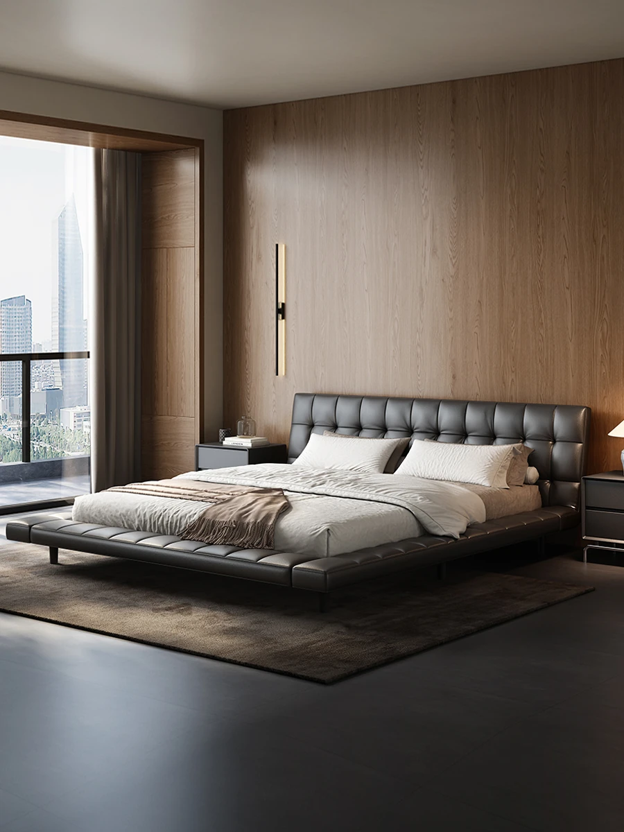 PUSHENG Genuine Leather Modern Minimalist Double Bed - Stylish Black Tatami Platform Bed for Master Bedroom, Perfect for Trendy Interiors