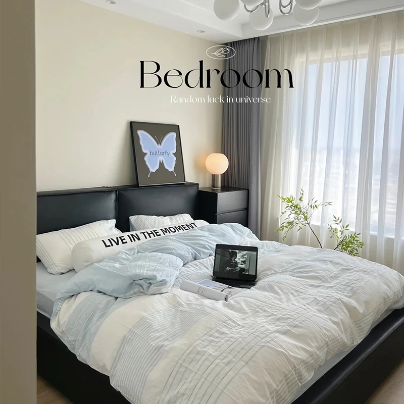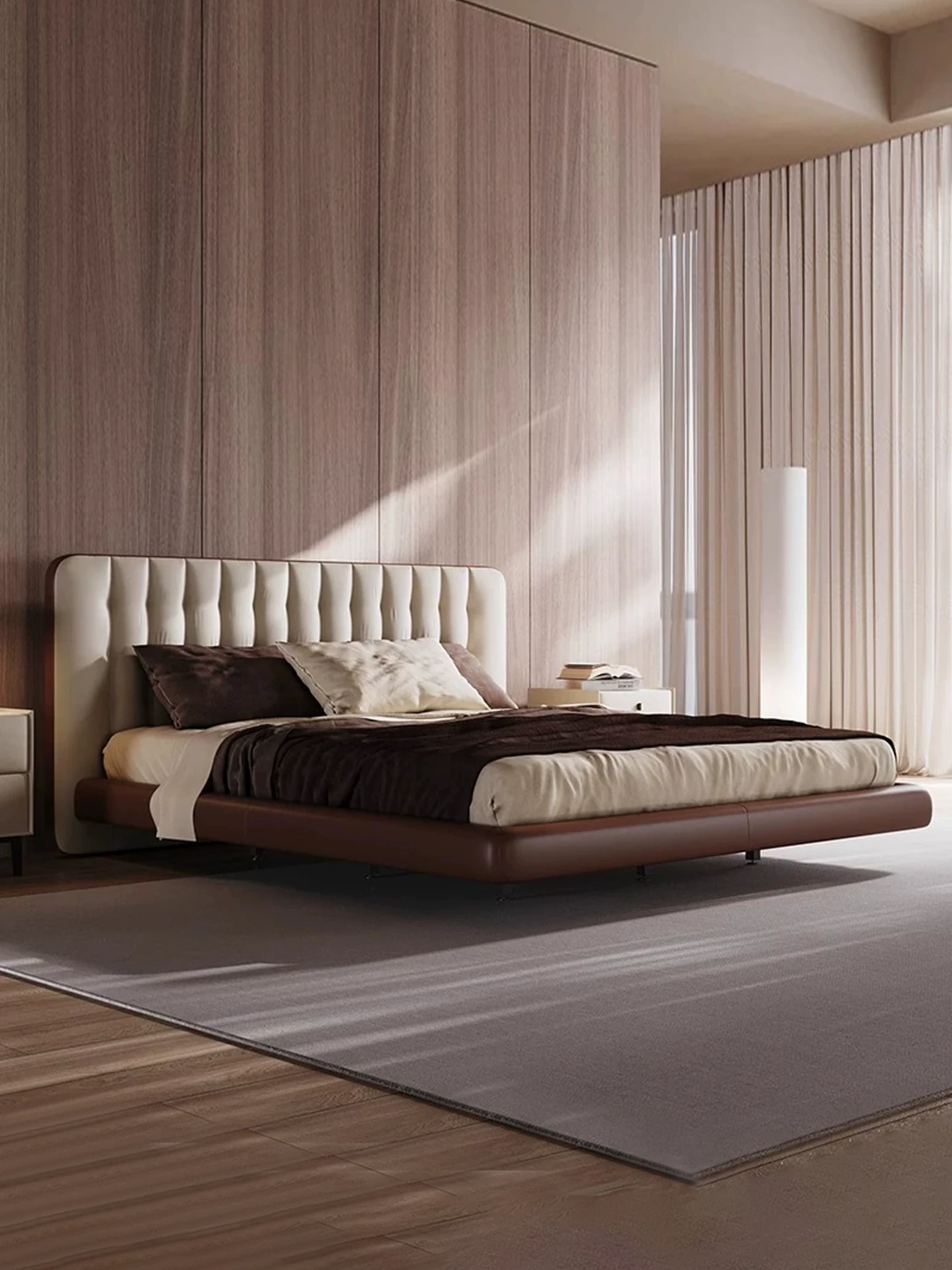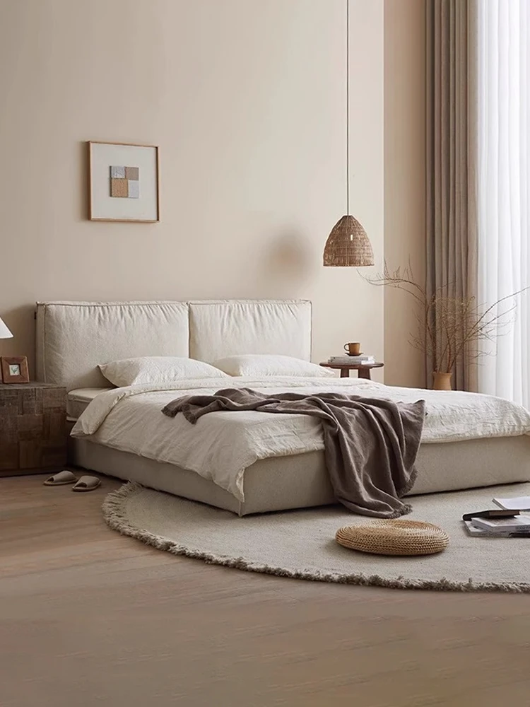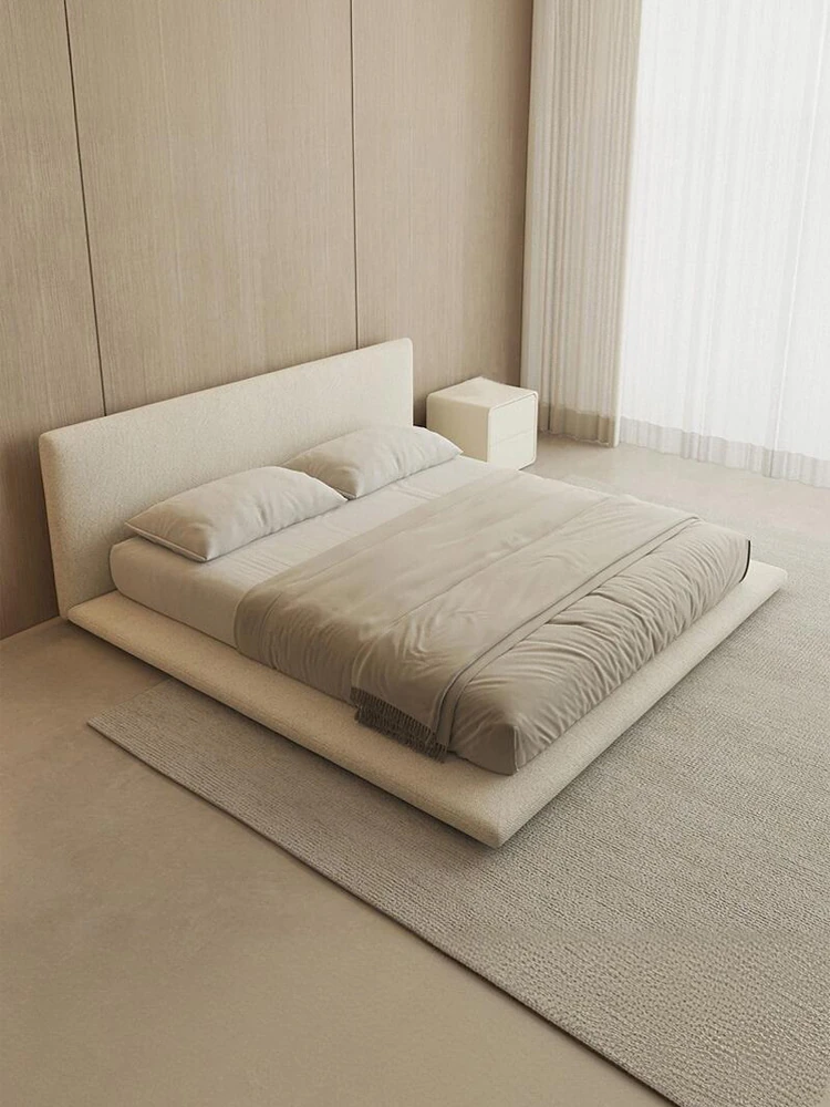 Pure Sheng Ji Leather Bed - Modern Minimalist Creamy Italian Style Double Bed for Master Bedroom, Elegant Ground-Level Wedding Bed