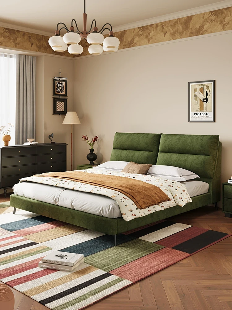 Pusengji Vintage Soft Package Wabi-Sabi Fabric Bed - Small Nordic Style Green Double Bed with Beech Wood Storage for Couples - Perfect for Compact Spaces