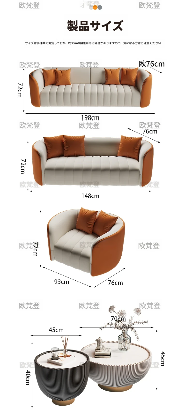 一人掛け椅子*2脚+三人掛け198cm*2脚+テーブル