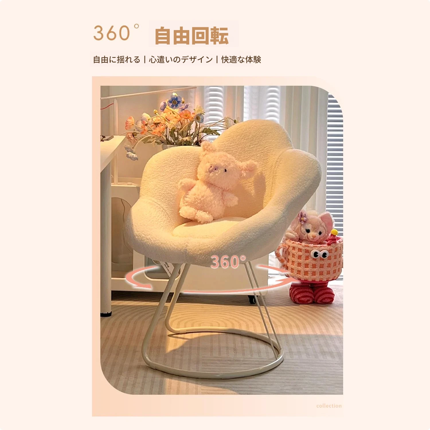 【360°回転可能】アイボリーのラビットファー⭐クリームホワイトフレーム