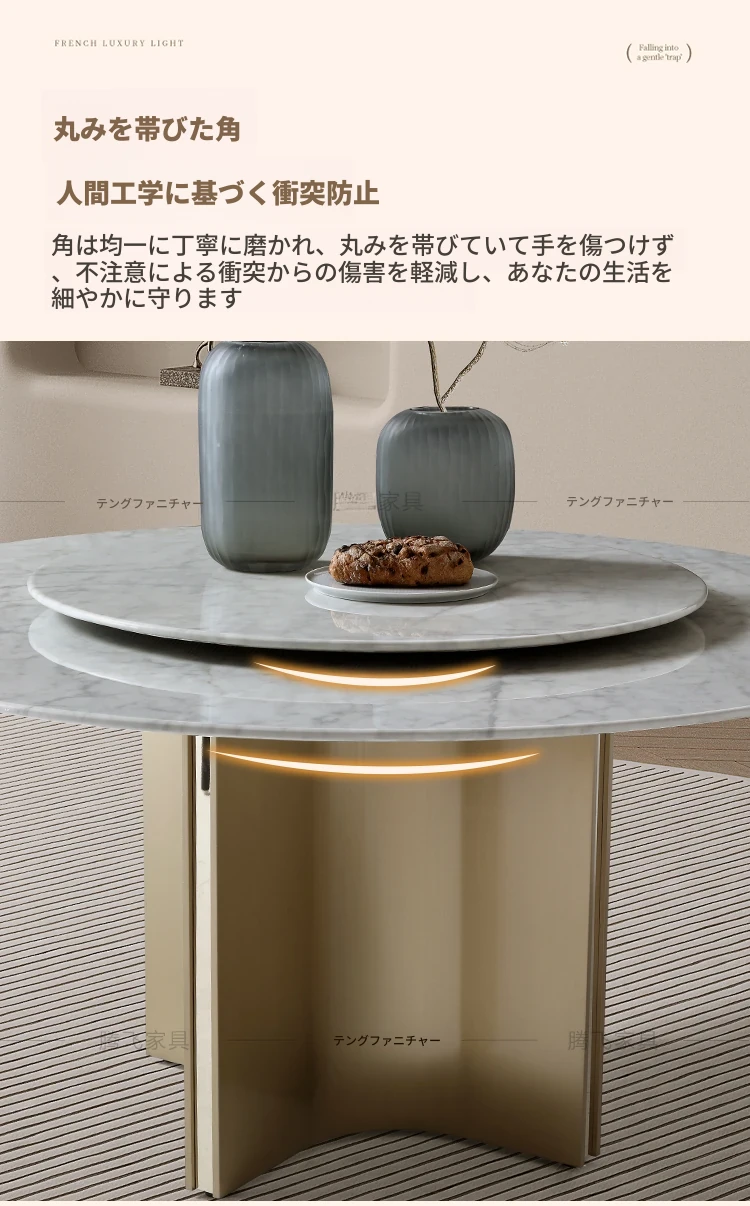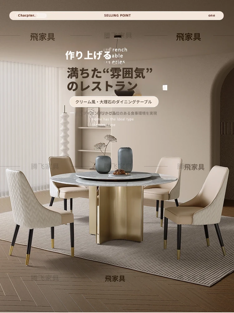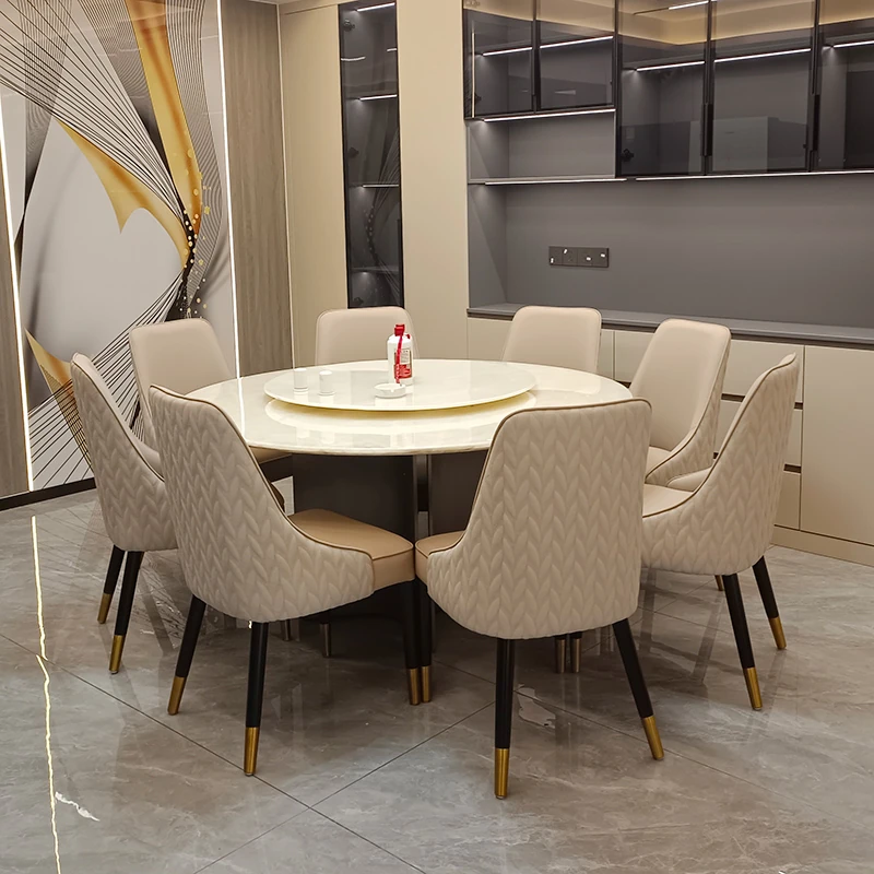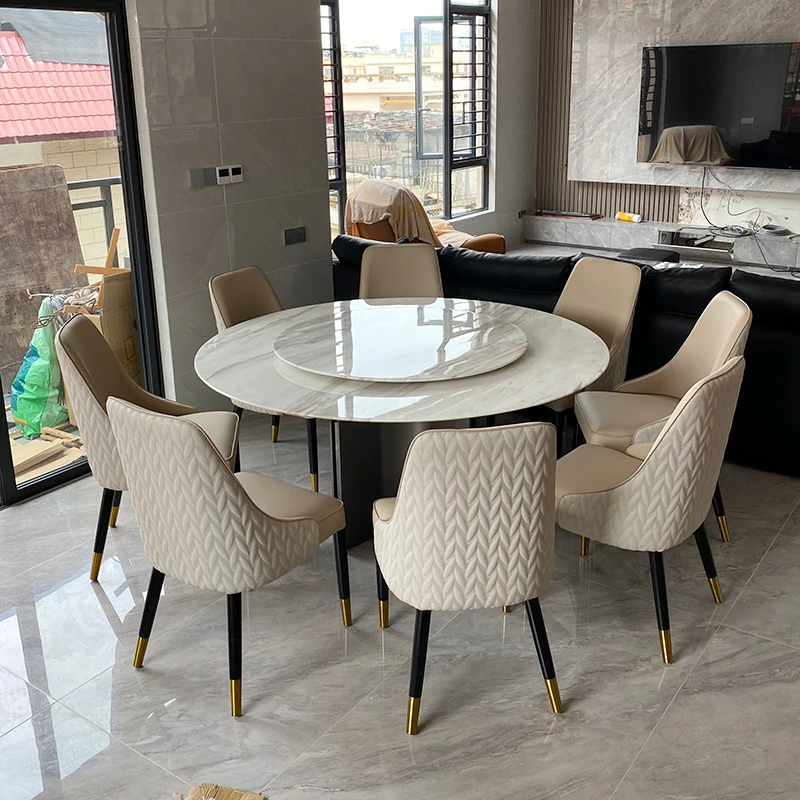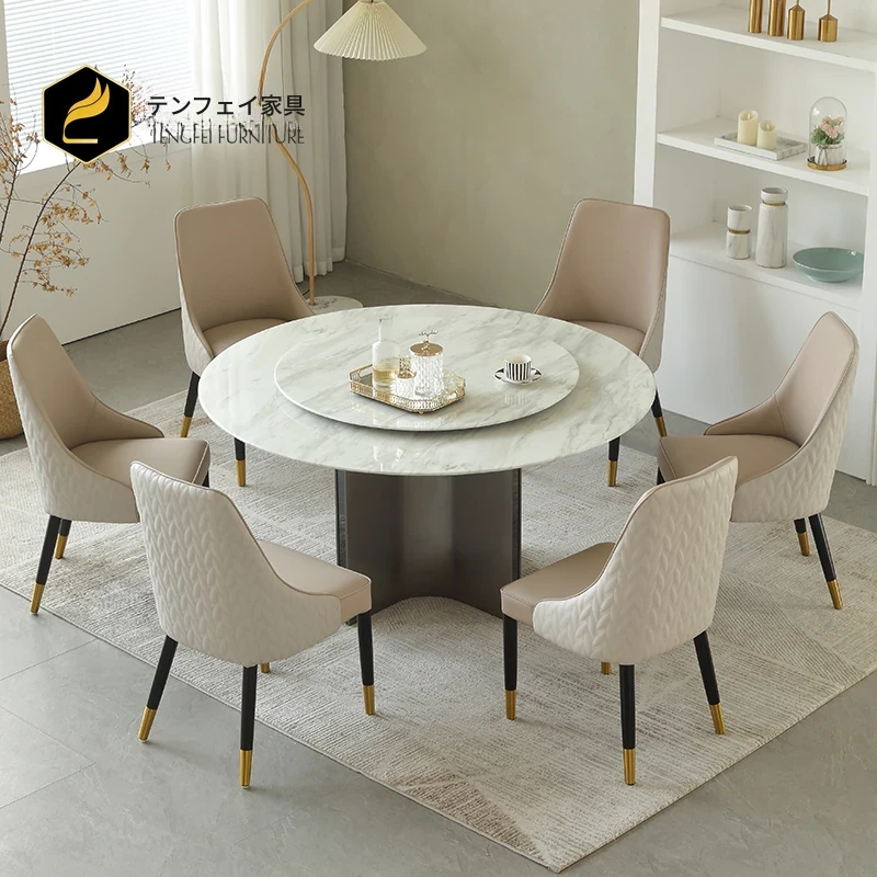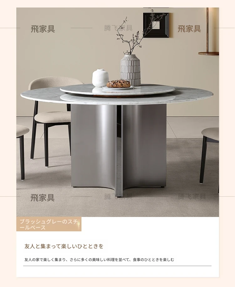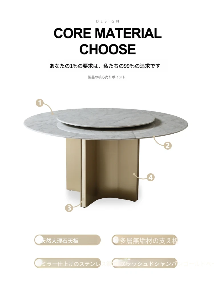 イタリアンミニマルデザインの天然ジャズホワイト大理石ラウンドテーブル - ステンレス製の高級デザイナーバージョン、ヴィラにぴったりな円形ダイニングテーブルとチェアセット!洗練された美しさと機能性を兼ね備えた一品です。