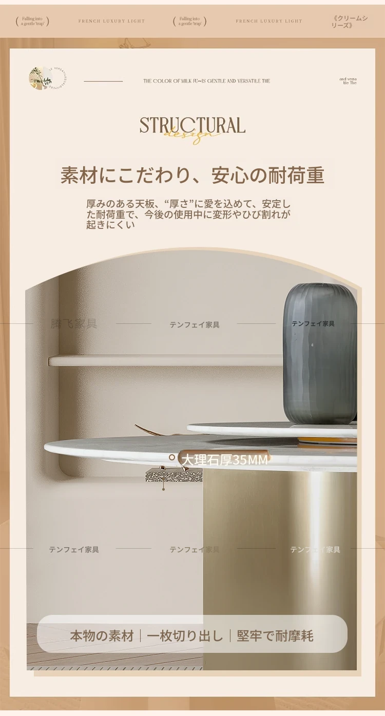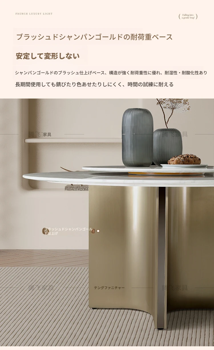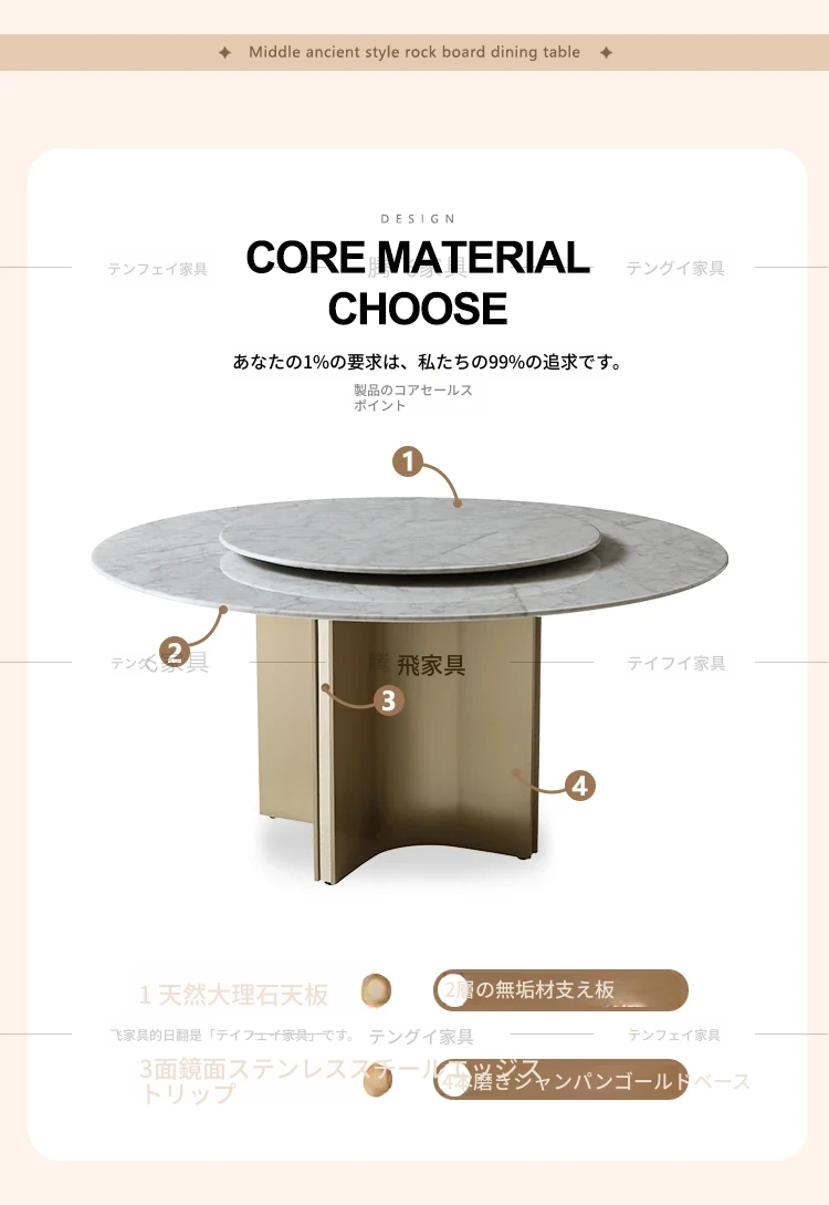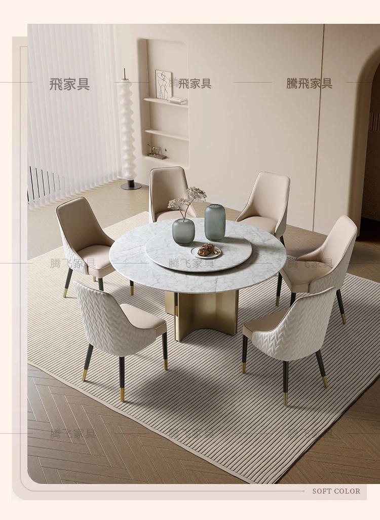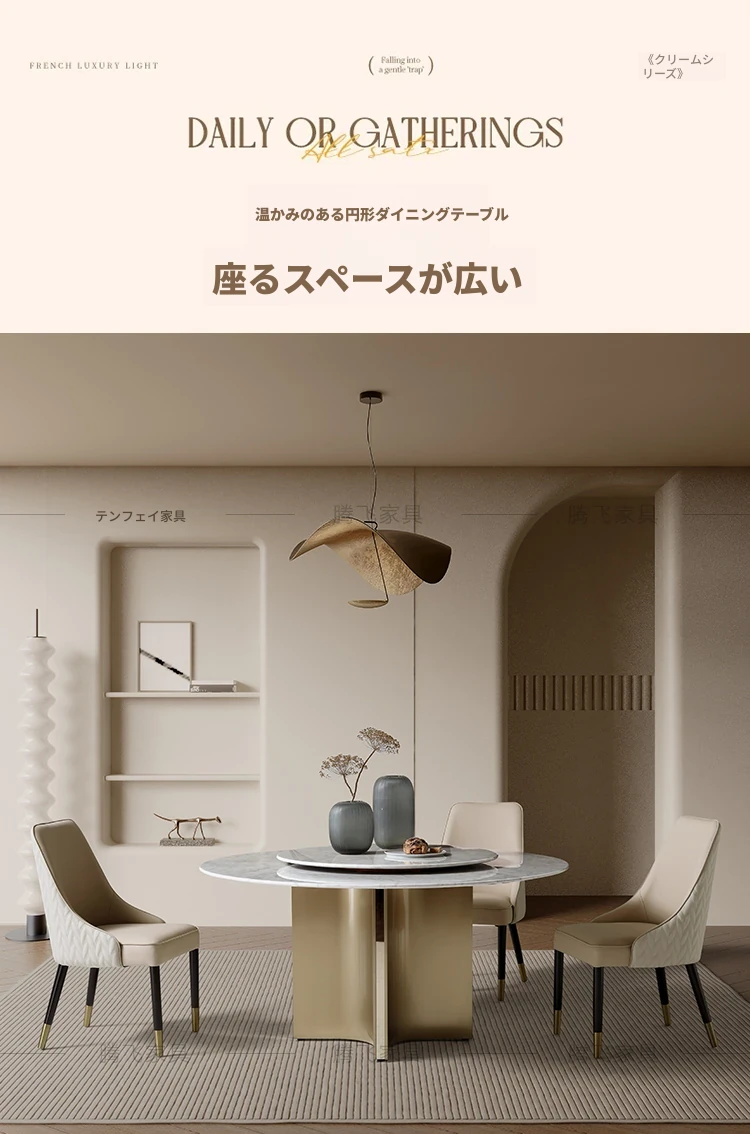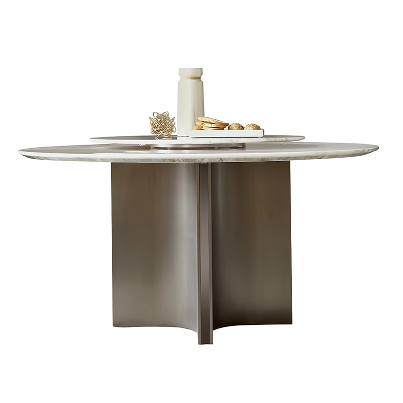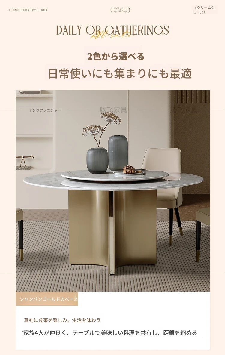 イタリアンミニマルデザインの天然ジャズホワイト大理石ラウンドテーブル - ステンレス製の高級デザイナーバージョン、ヴィラにぴったりな円形ダイニングテーブルとチェアセット!洗練された美しさと機能性を兼ね備えた一品です。