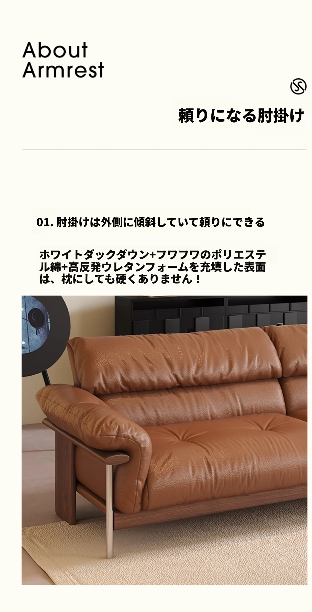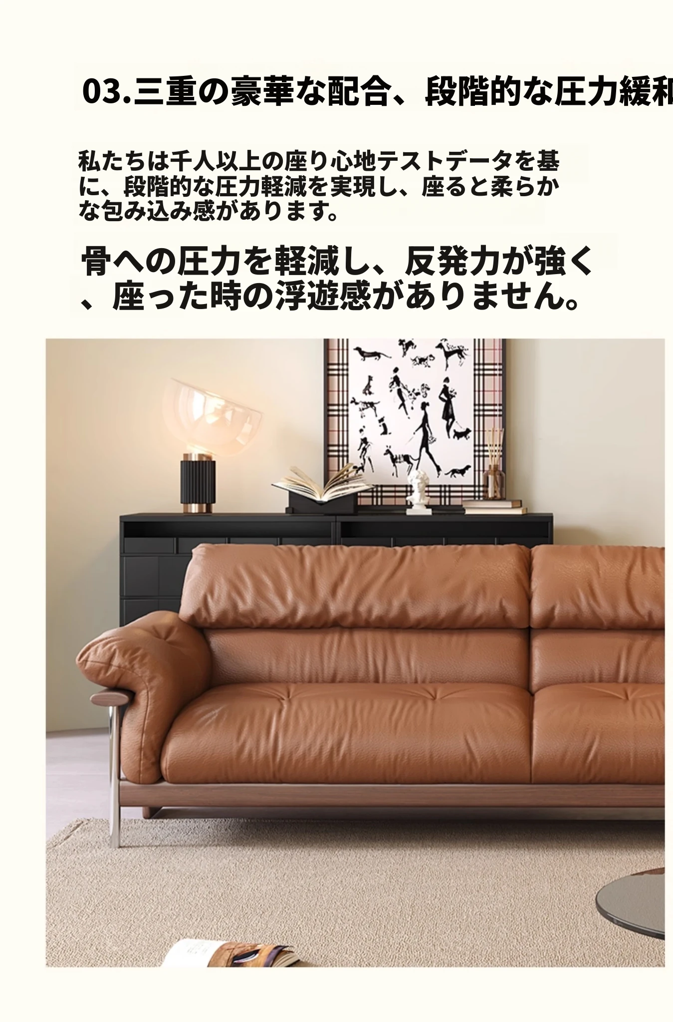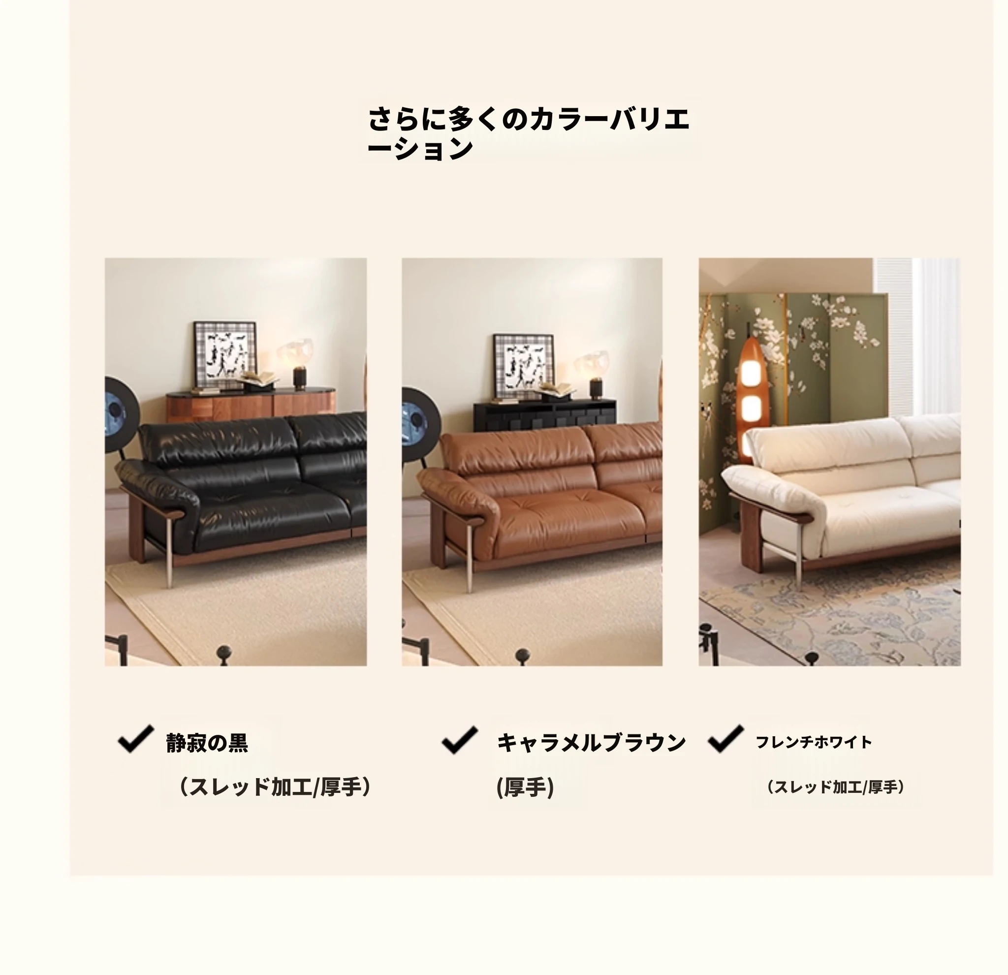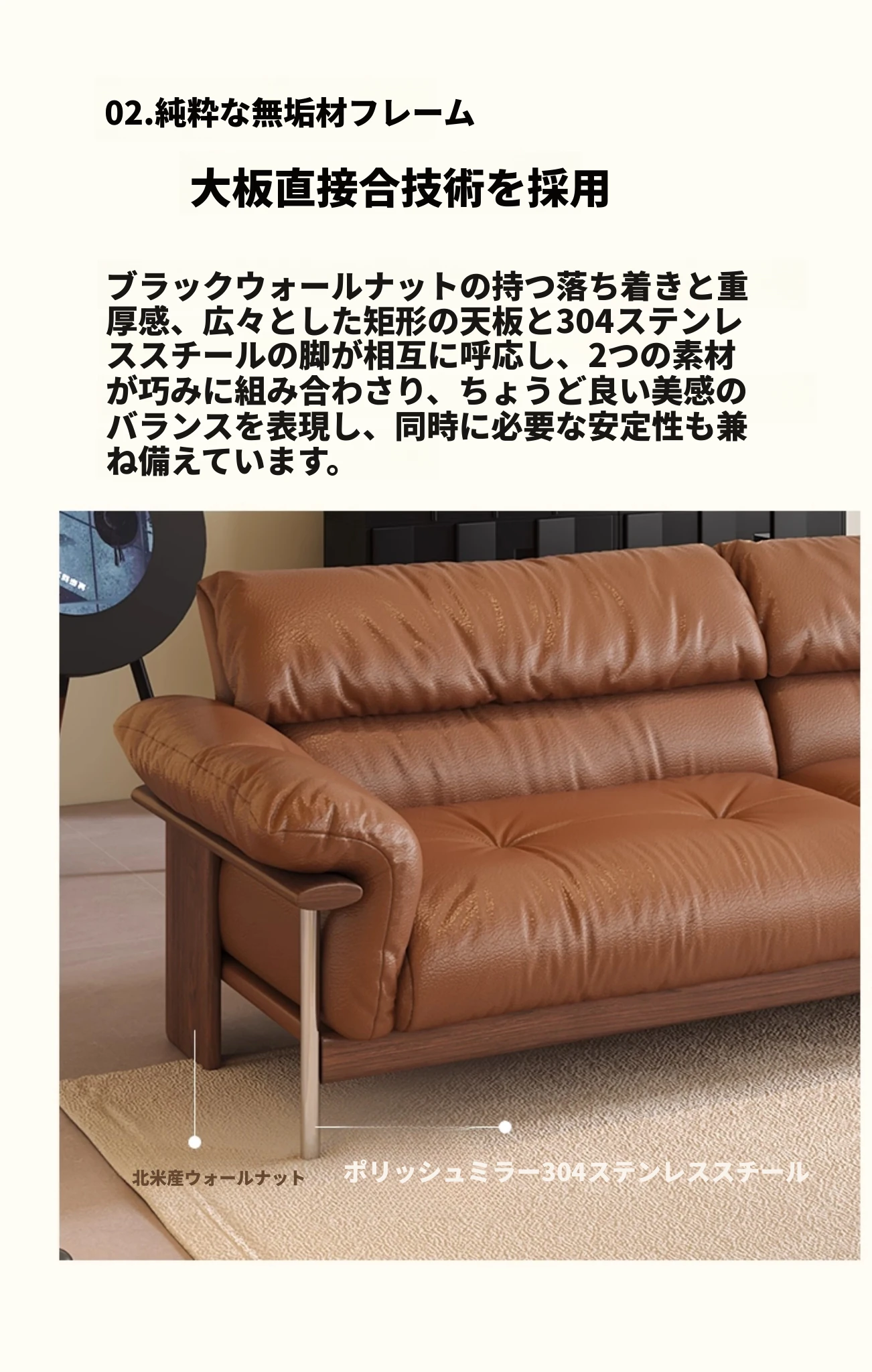 【正規JOソファ】北米ブラックウォールナット/2.65メートルキャラメルブラウン-厚手肉感のトップグレイン牛革{360°全皮}.