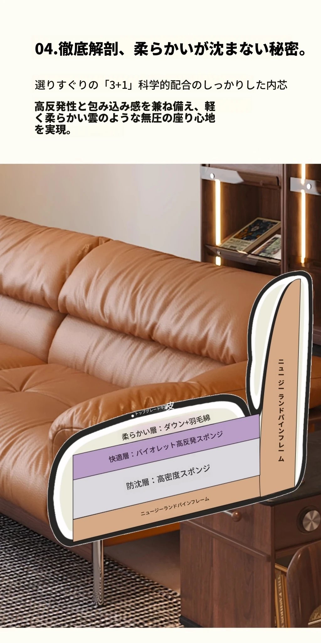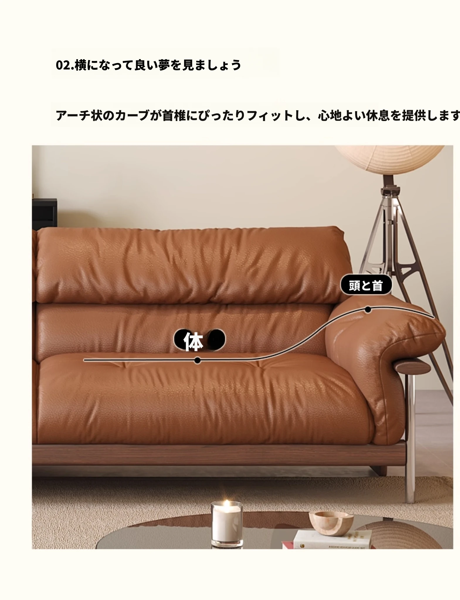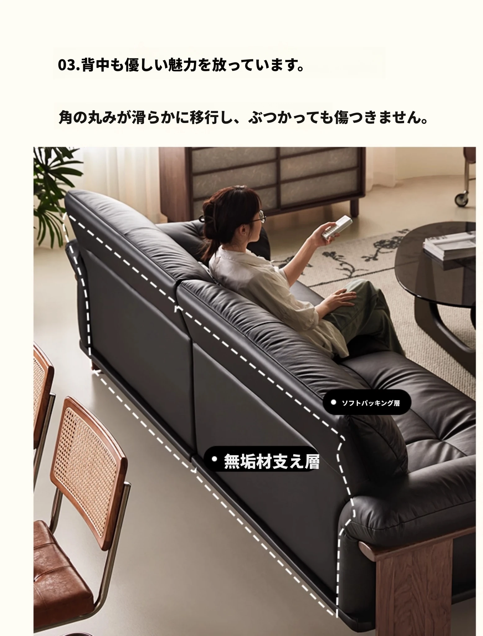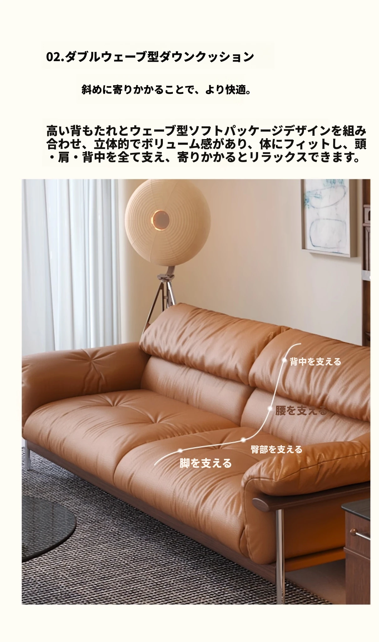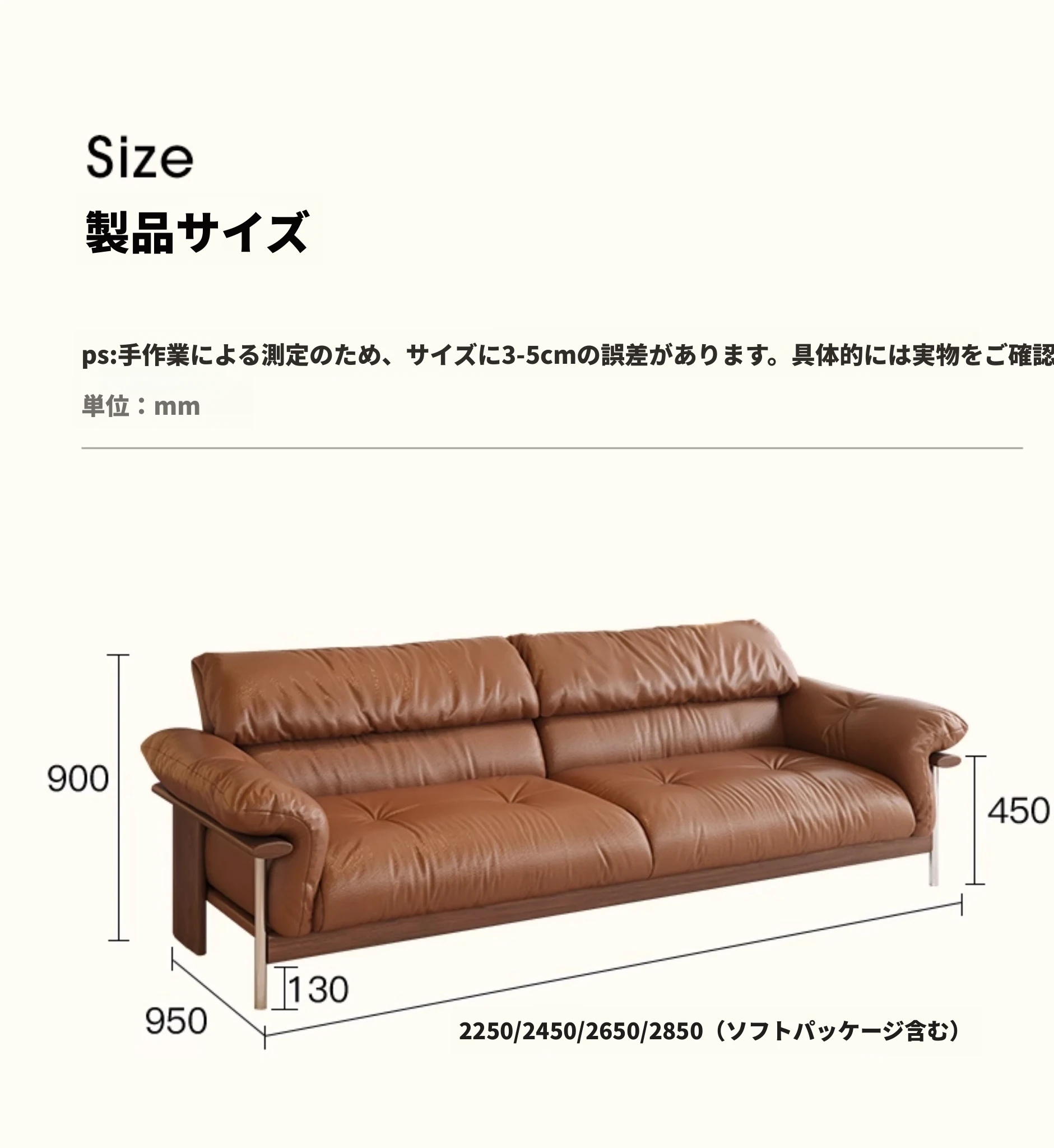 【正規JOソファ】北米ブラックウォールナット/2.65メートルキャラメルブラウン-厚手肉感のトップグレイン牛革{360°全皮}.