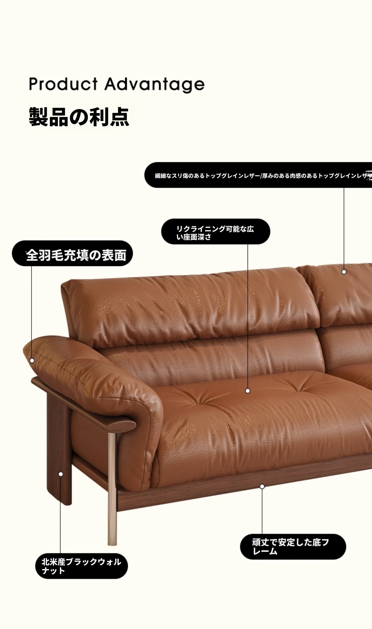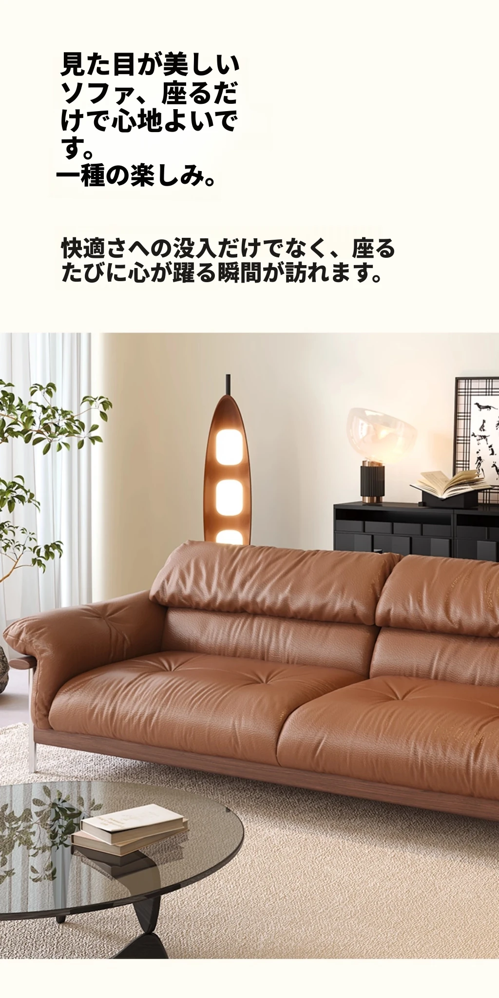 加減ライフのジョーソファー - ブラックウォールナット無垢材と本革使用のヴィンテージブラウン直線デザイン、家庭のリビングにぴったりの贅沢な真皮ソファ!おしゃれさと快適さを兼ね備えた一品です。