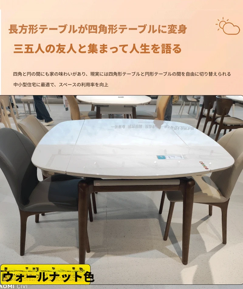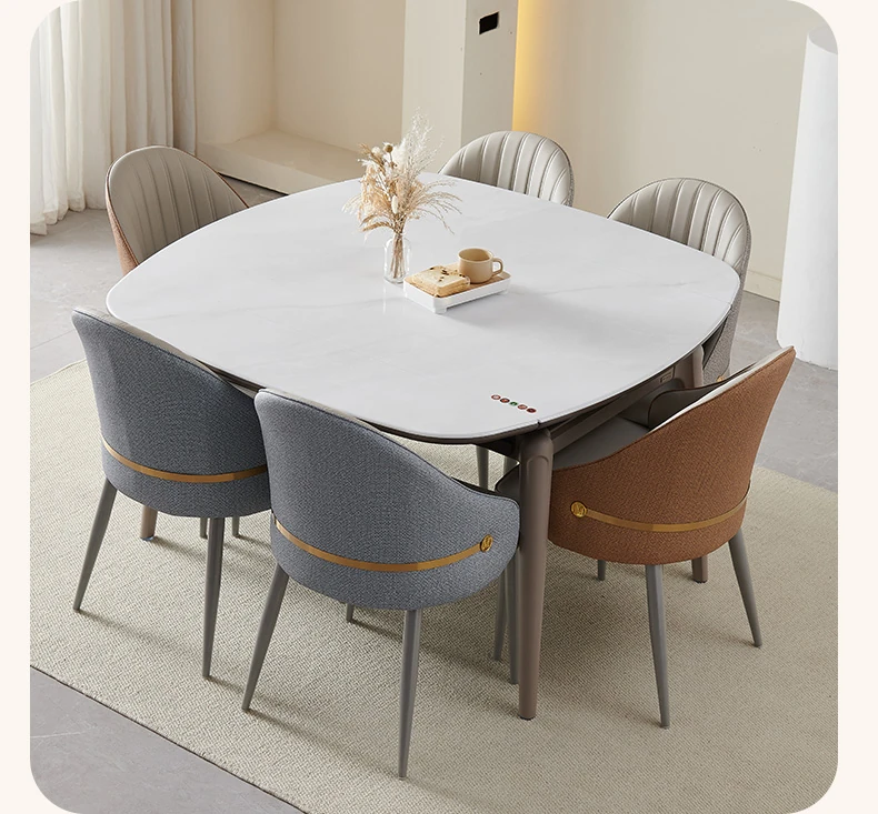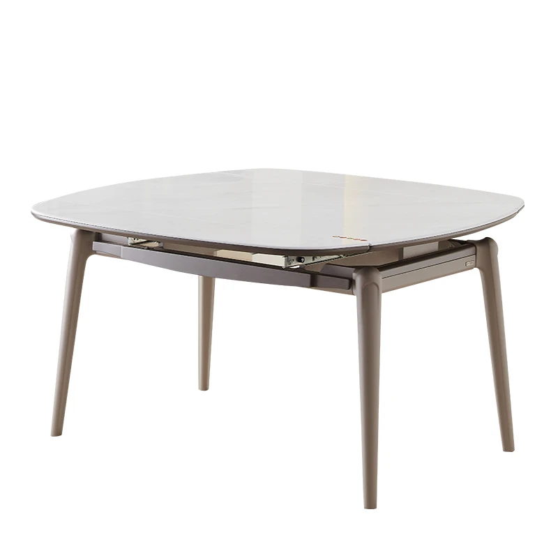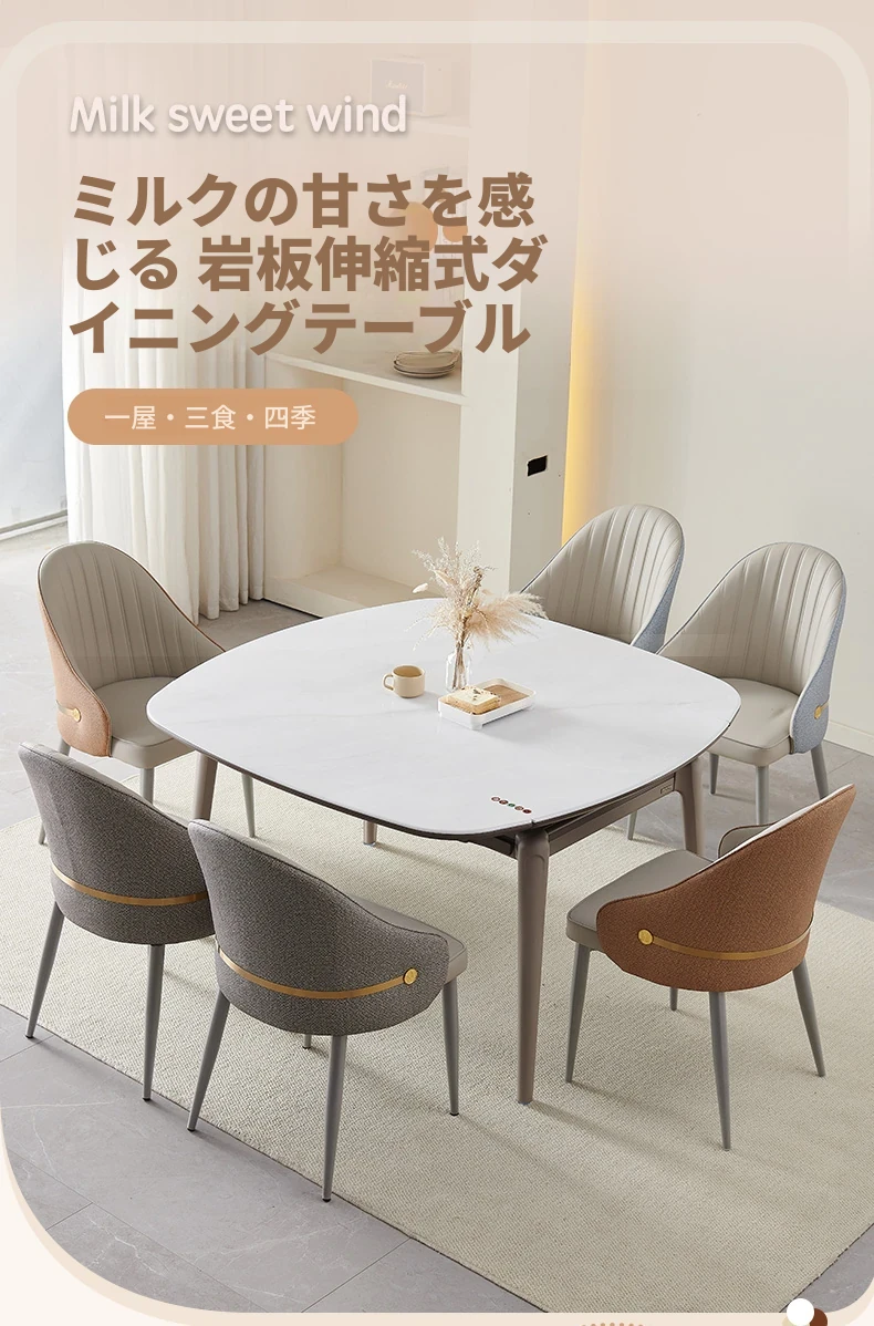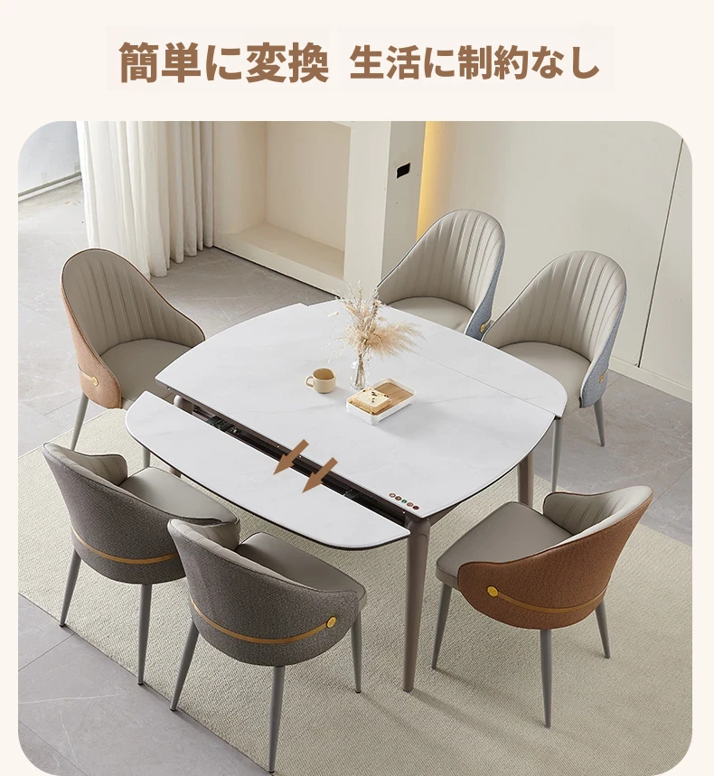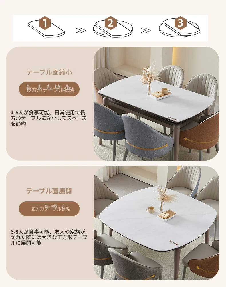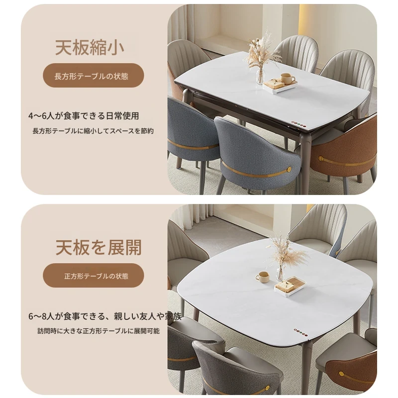 モダンでシンプルな折りたたみ式イタリアンスタイルのマイクロクリスタルストーンテーブルセット - 伸縮可能な四角形ダイニングテーブルとチェアのコンビネーション、軽やかなラグジュアリーを感じる家族用食卓。