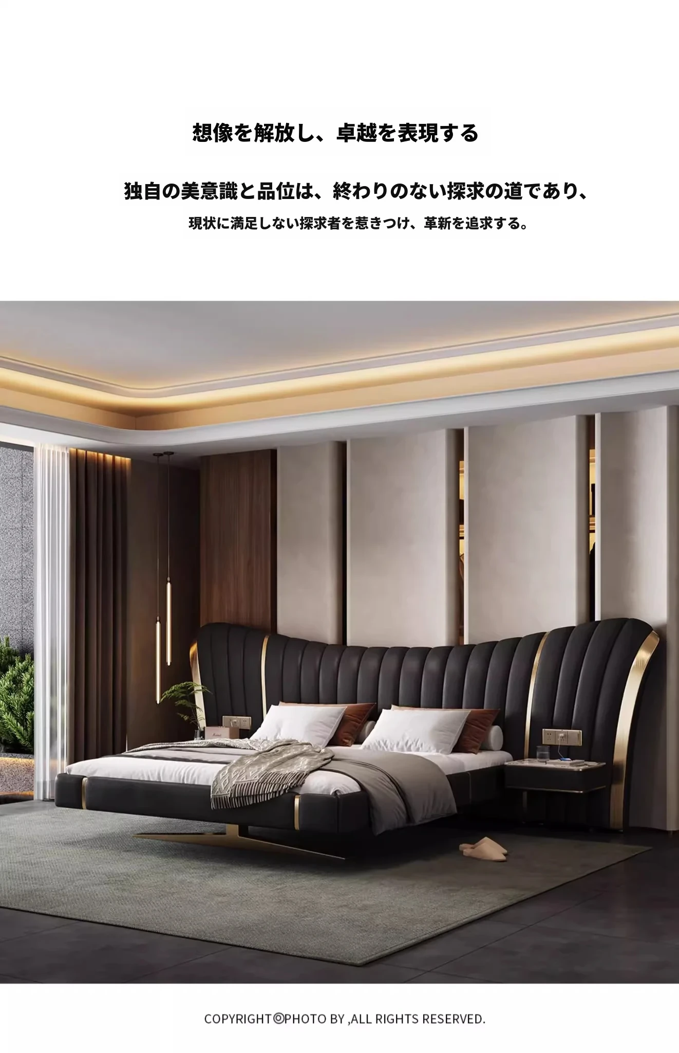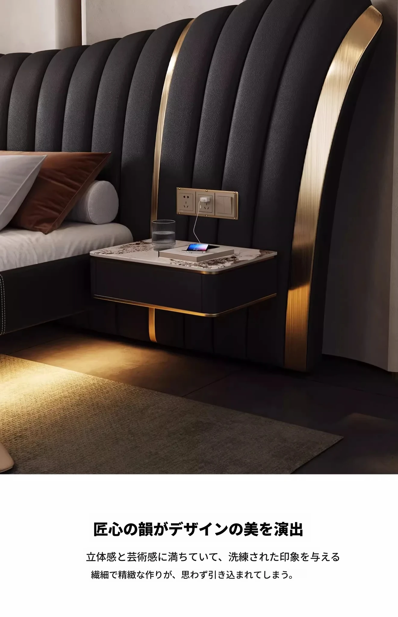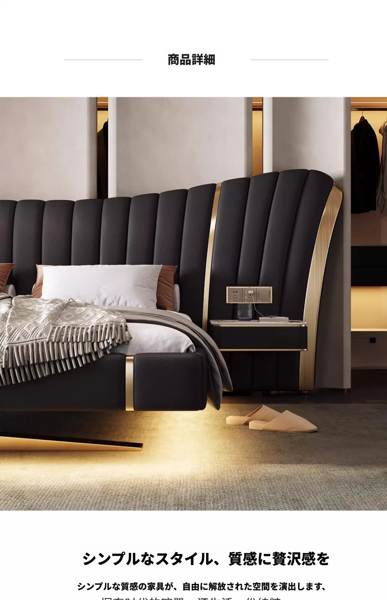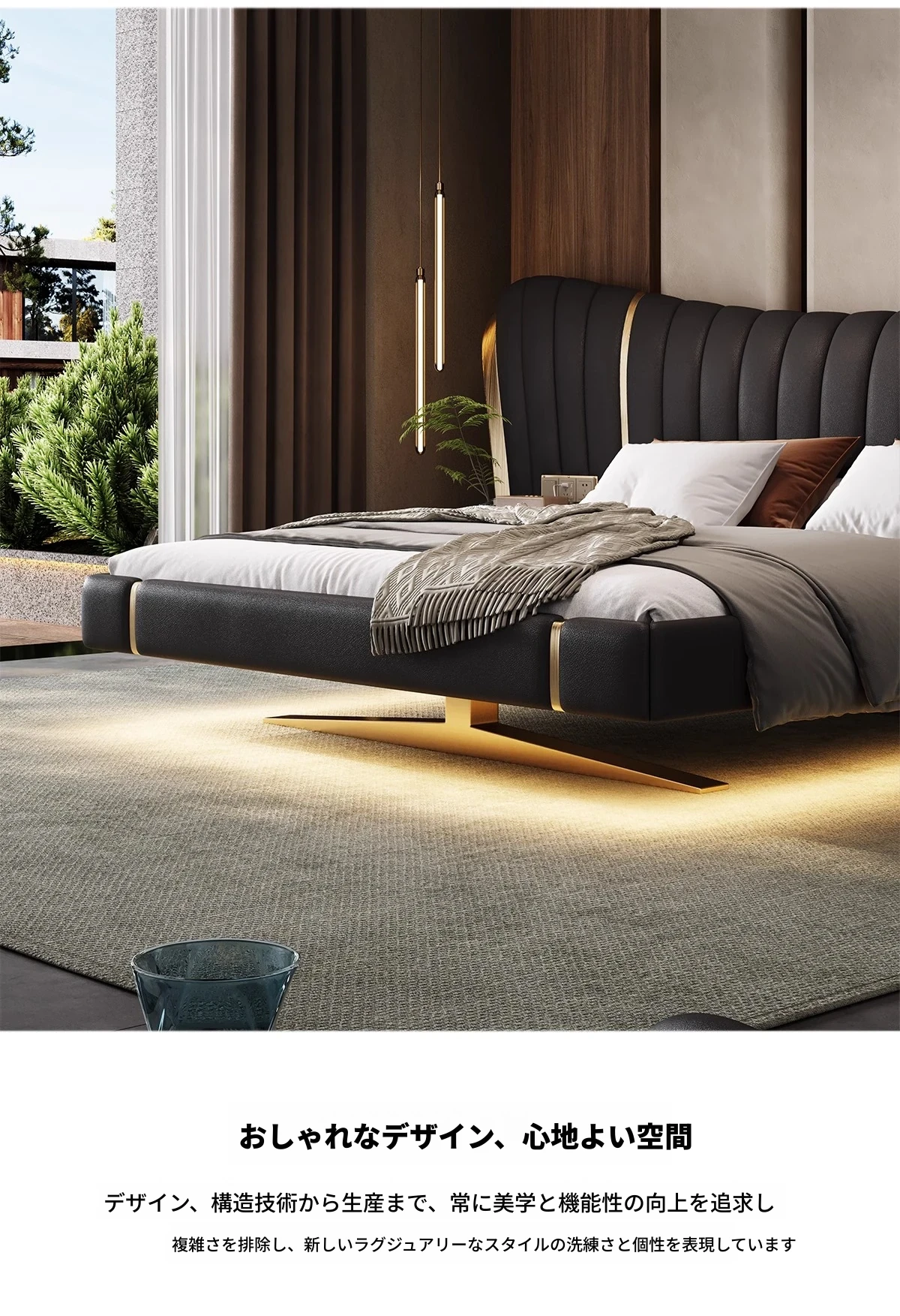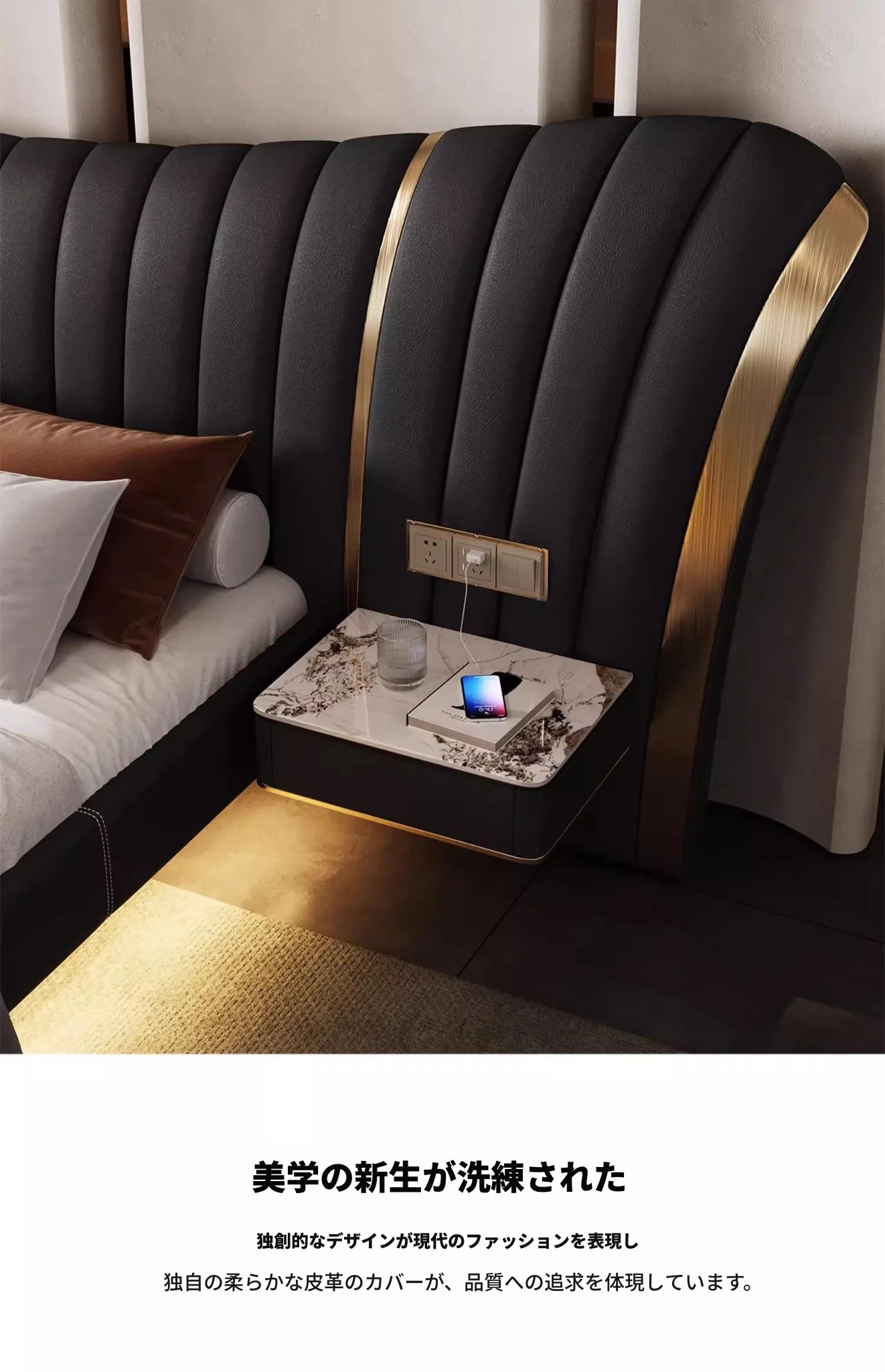朴笙記のイタリアンレザー製軽奢華ベッド - モダンでシンプルなデザイン、1.8m主寝室用ダブルベッド、2mの収納スペース付き!快適でスタイリッシュな睡眠空間をお楽しみください。