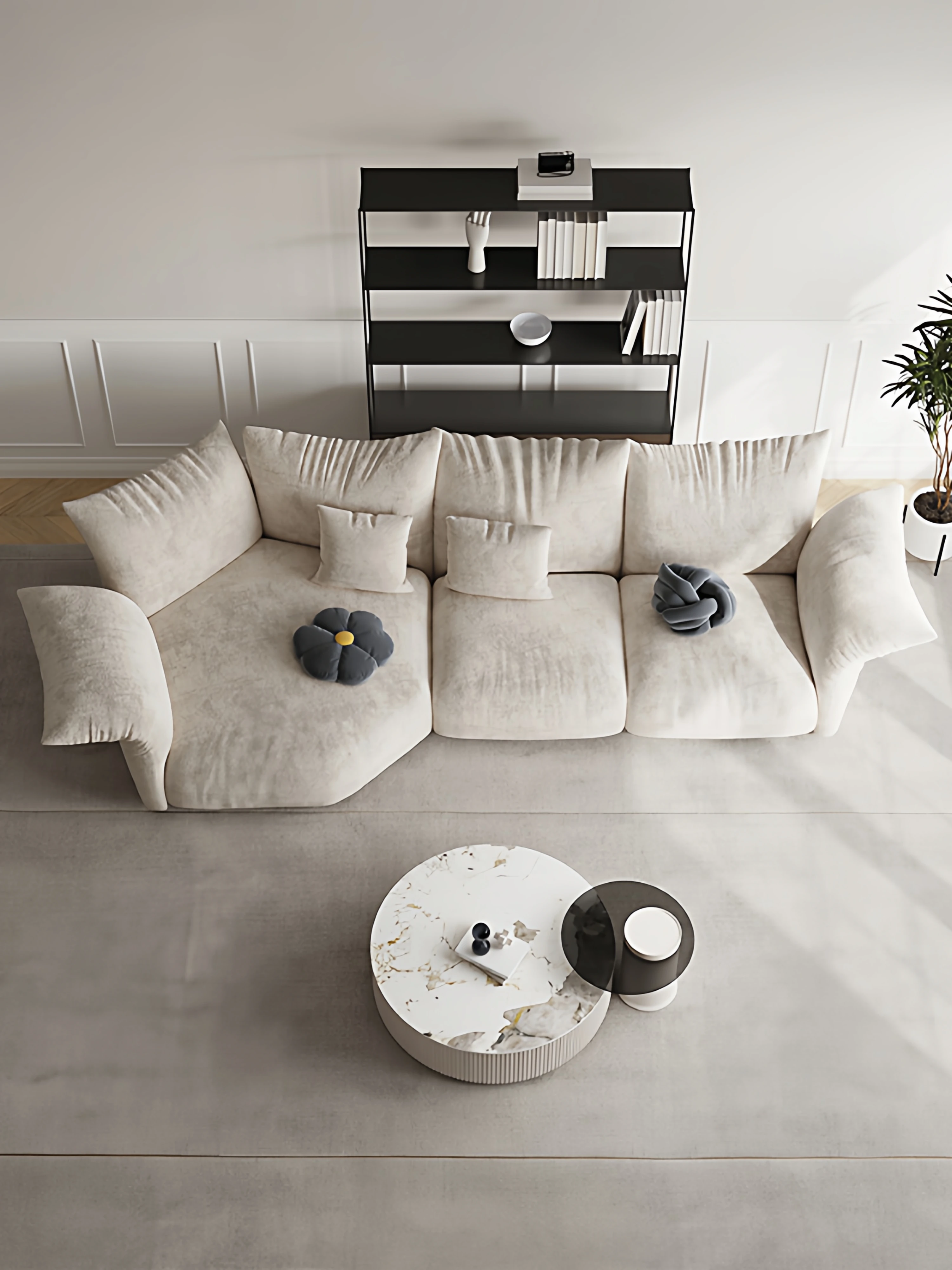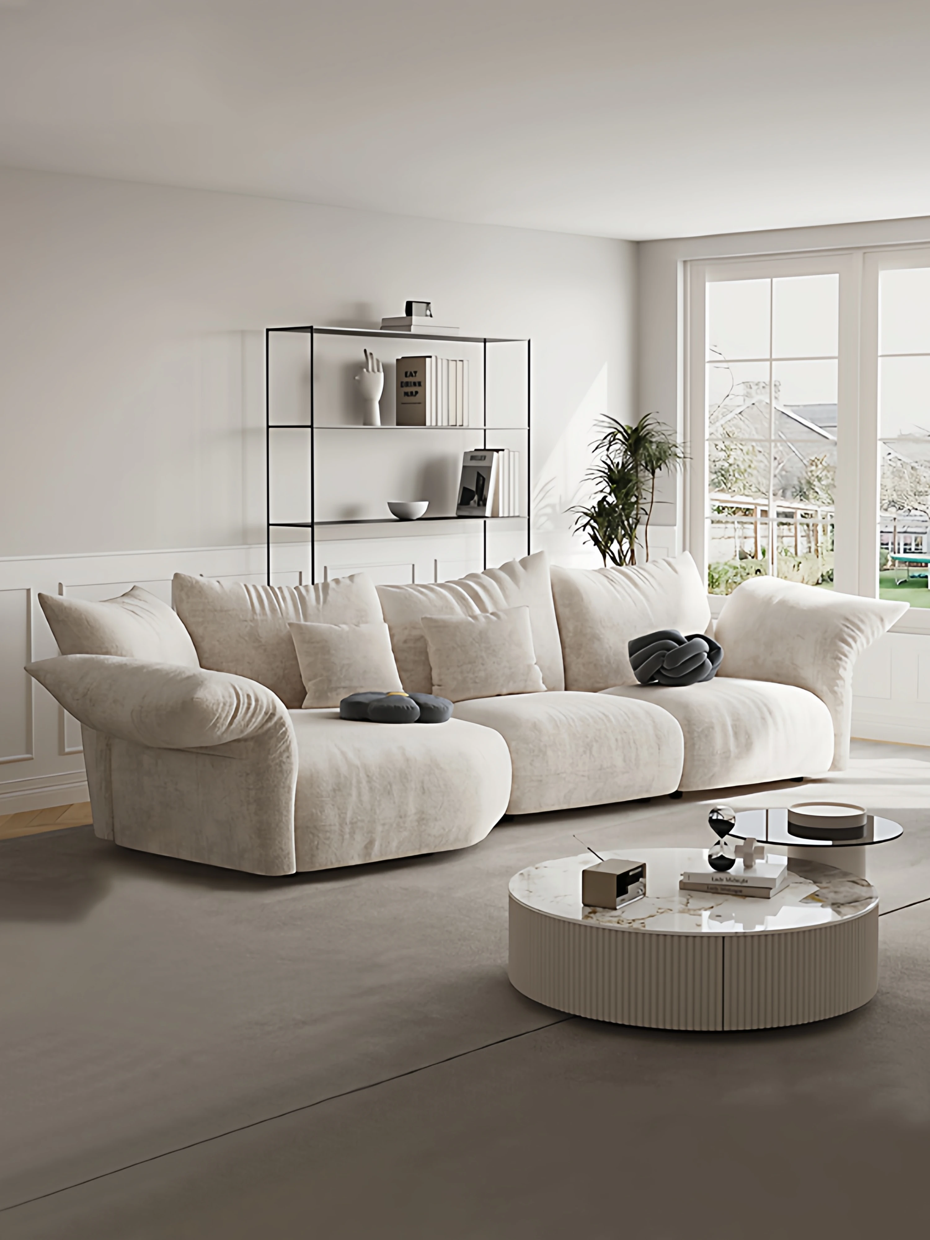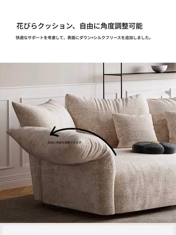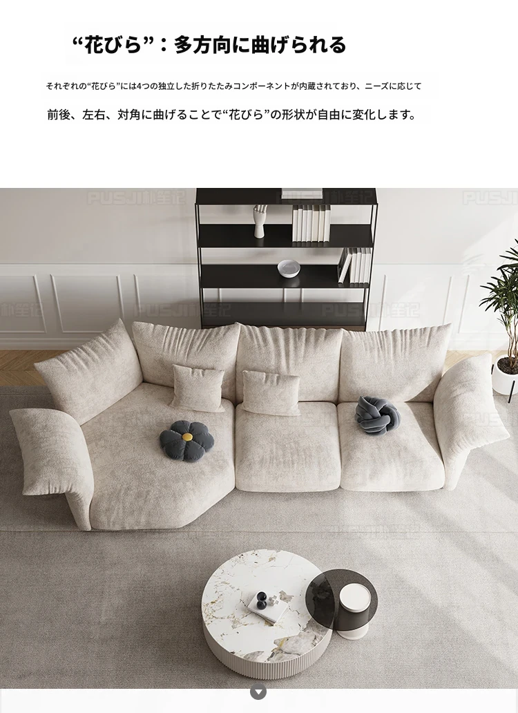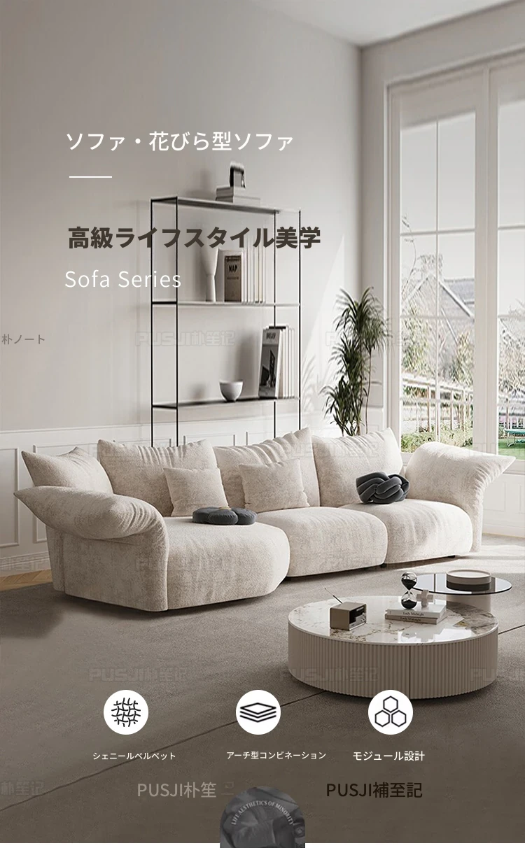 朴笙記の花びらソファー - シンプルで優雅なクリーム色のベージュファブリックソファ、別荘にぴったりの大きなL字型デザインで、心地よいひとときを演出します。