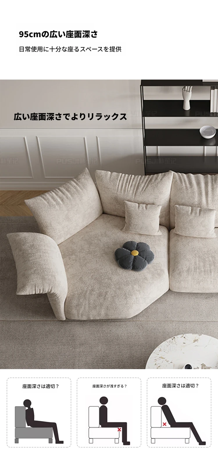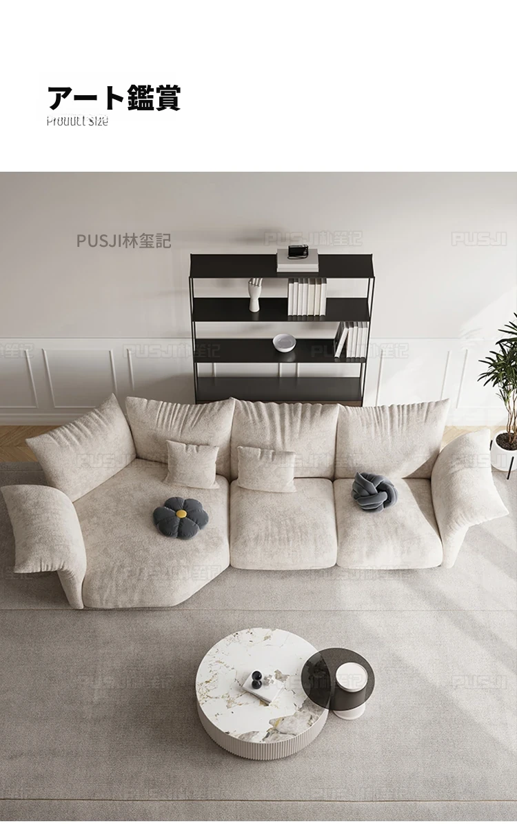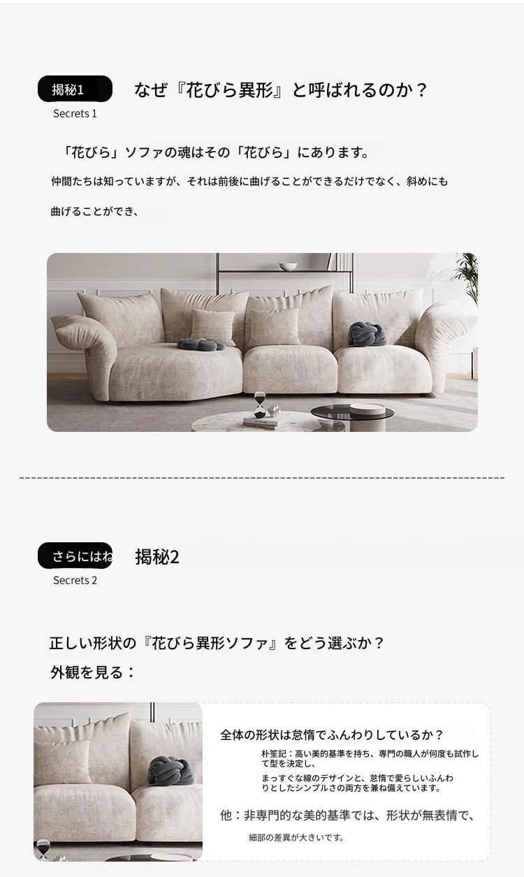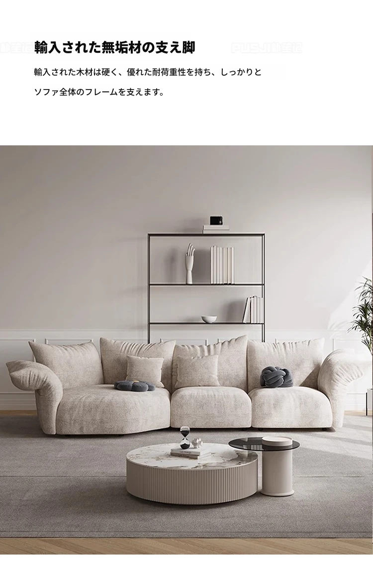 朴笙記の花びらソファー - シンプルで優雅なクリーム色のベージュファブリックソファ、別荘にぴったりの大きなL字型デザインで、心地よいひとときを演出します。