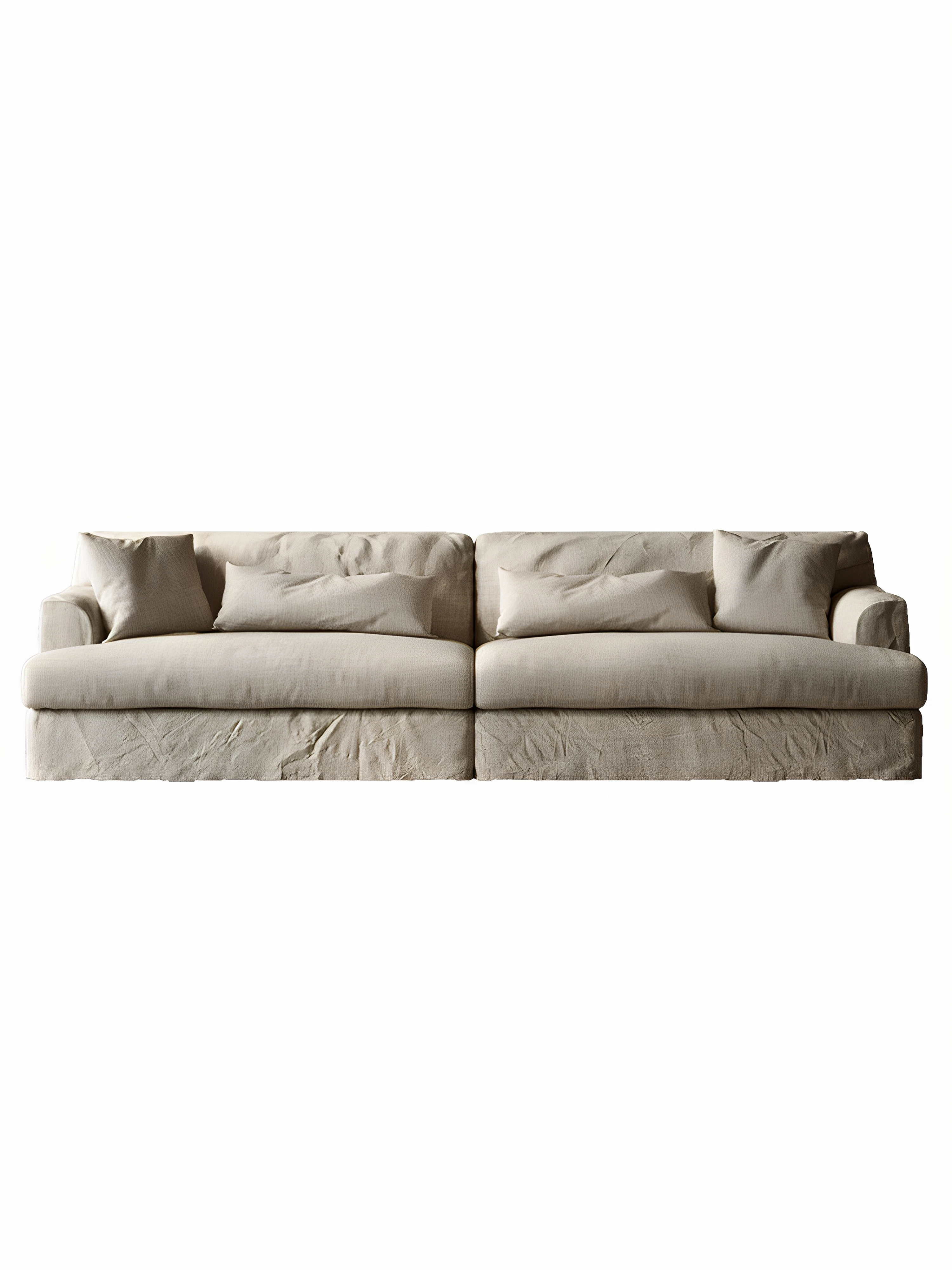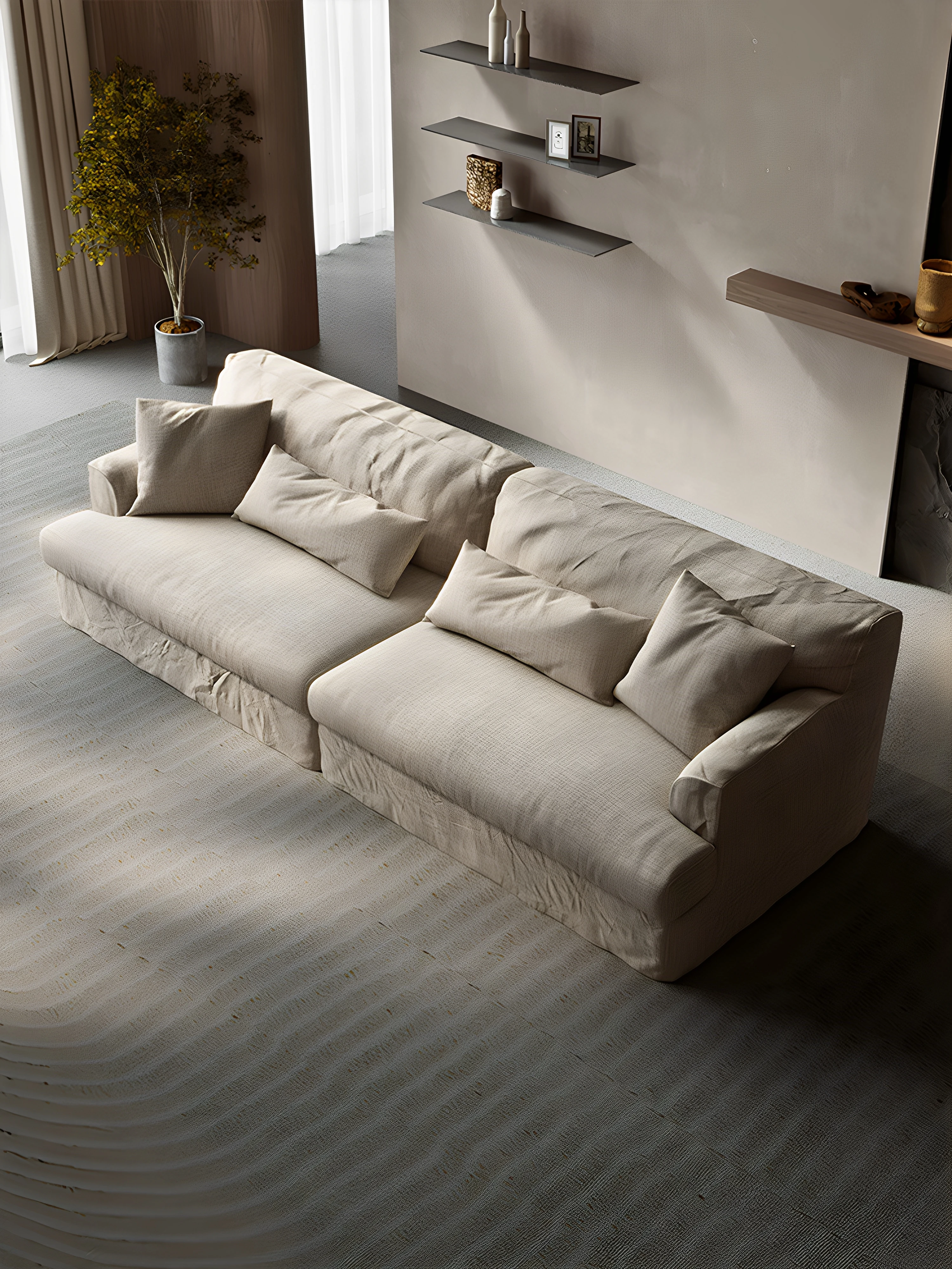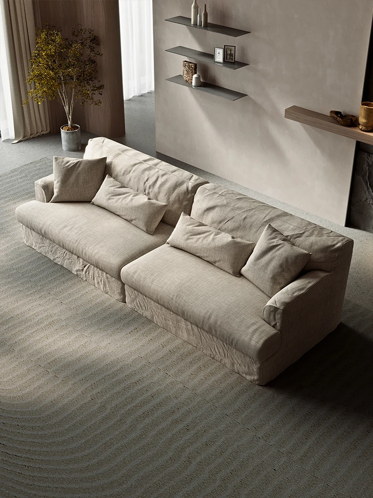 朴素で心地よい侘寂風の麻とコットンのソファ - 洗濯可能なリネン素材、3人掛け直線デザイン、民宿やリビングにぴったりの爽やかな風を感じるソファ!