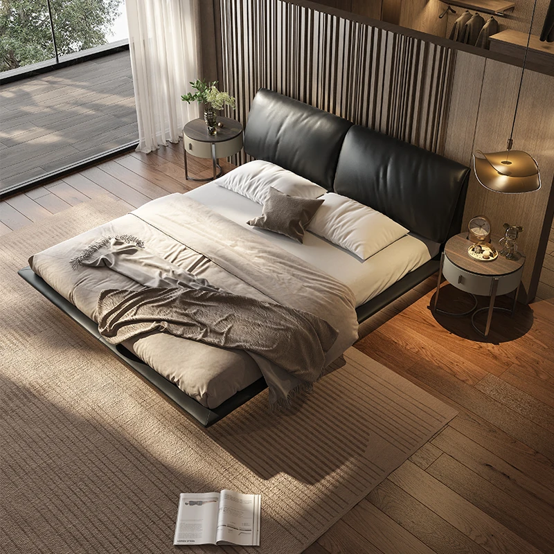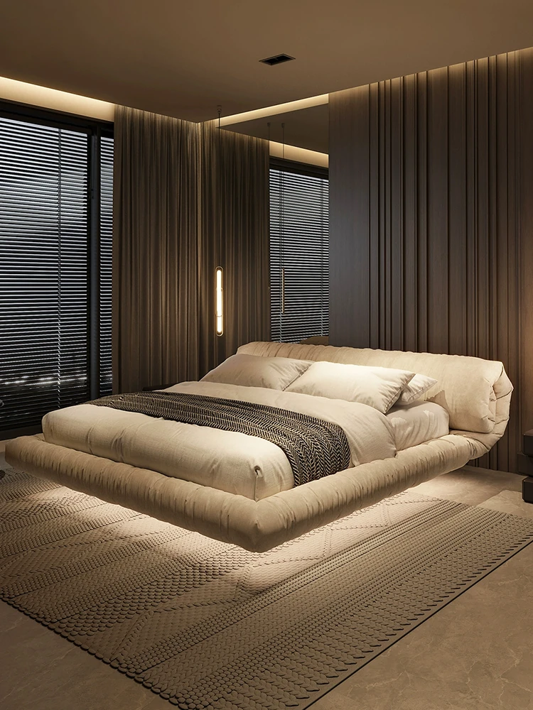 朴笙記の本革パフスイートルームベッド - モダンでシンプルなクリーム風デザイン、イタリアンミニマリズムのダブルベッド、浮遊感のある素敵な婚礼ベッド。あなたの夢の空間を演出します!