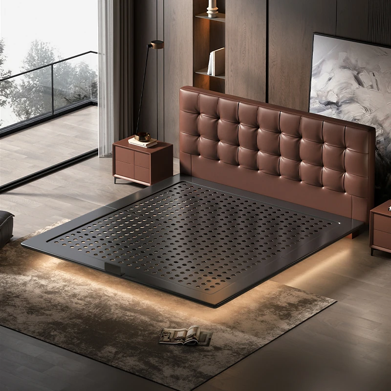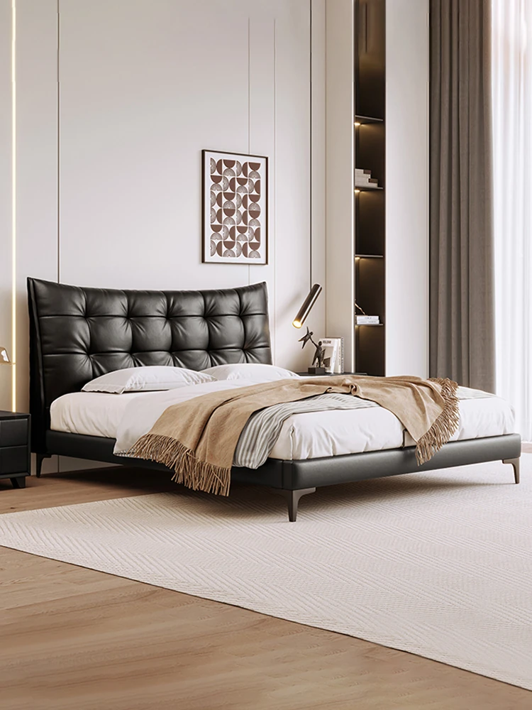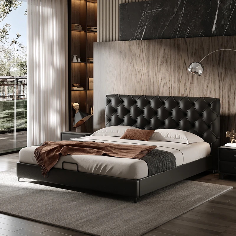 朴笙記のレトロラッチ本革ベッド - 高級感溢れるイタリアンミニマリズムの主寝室用ダブルベッド。シンプルでありながら、贅沢なひとときを演出します。