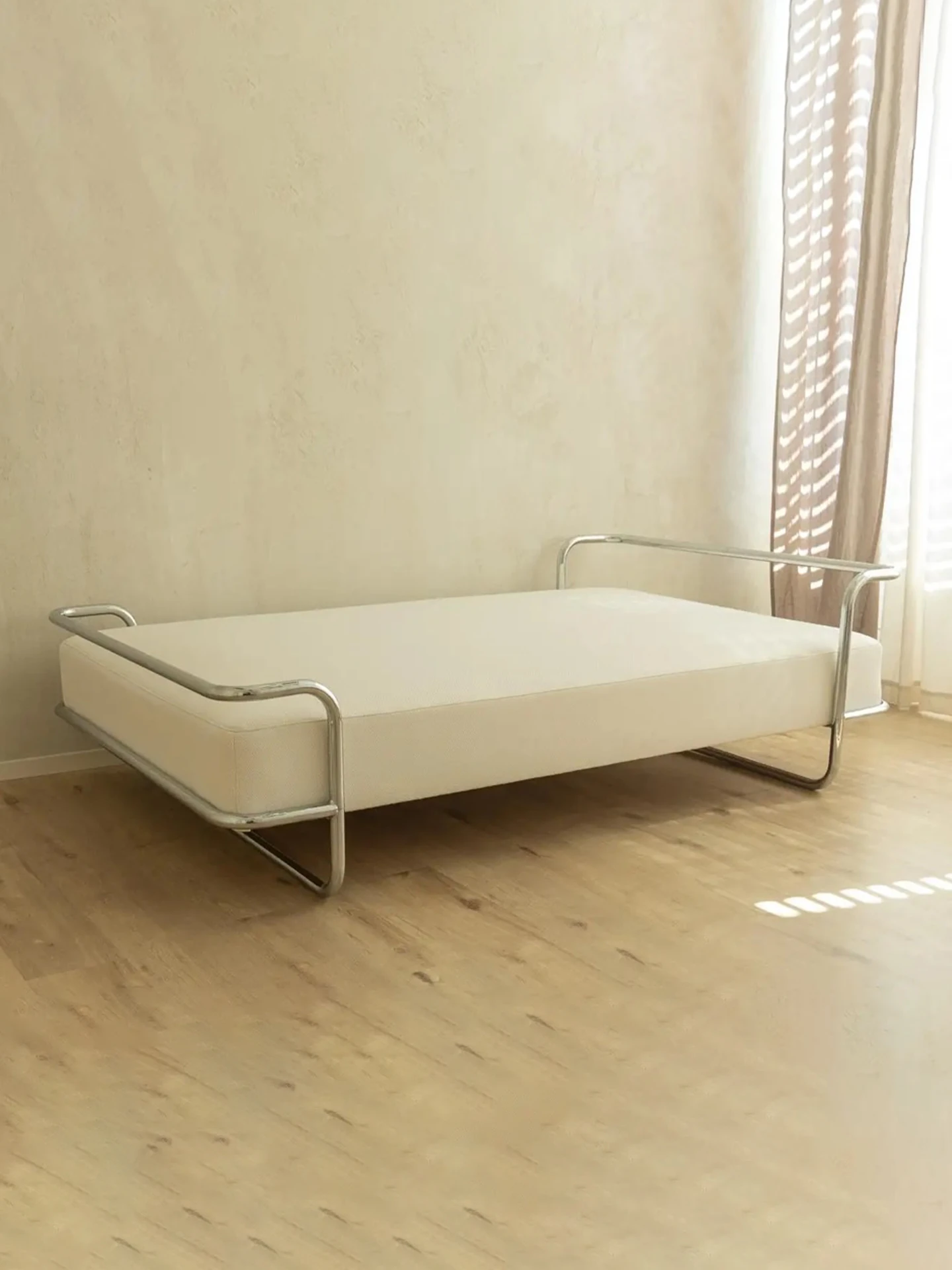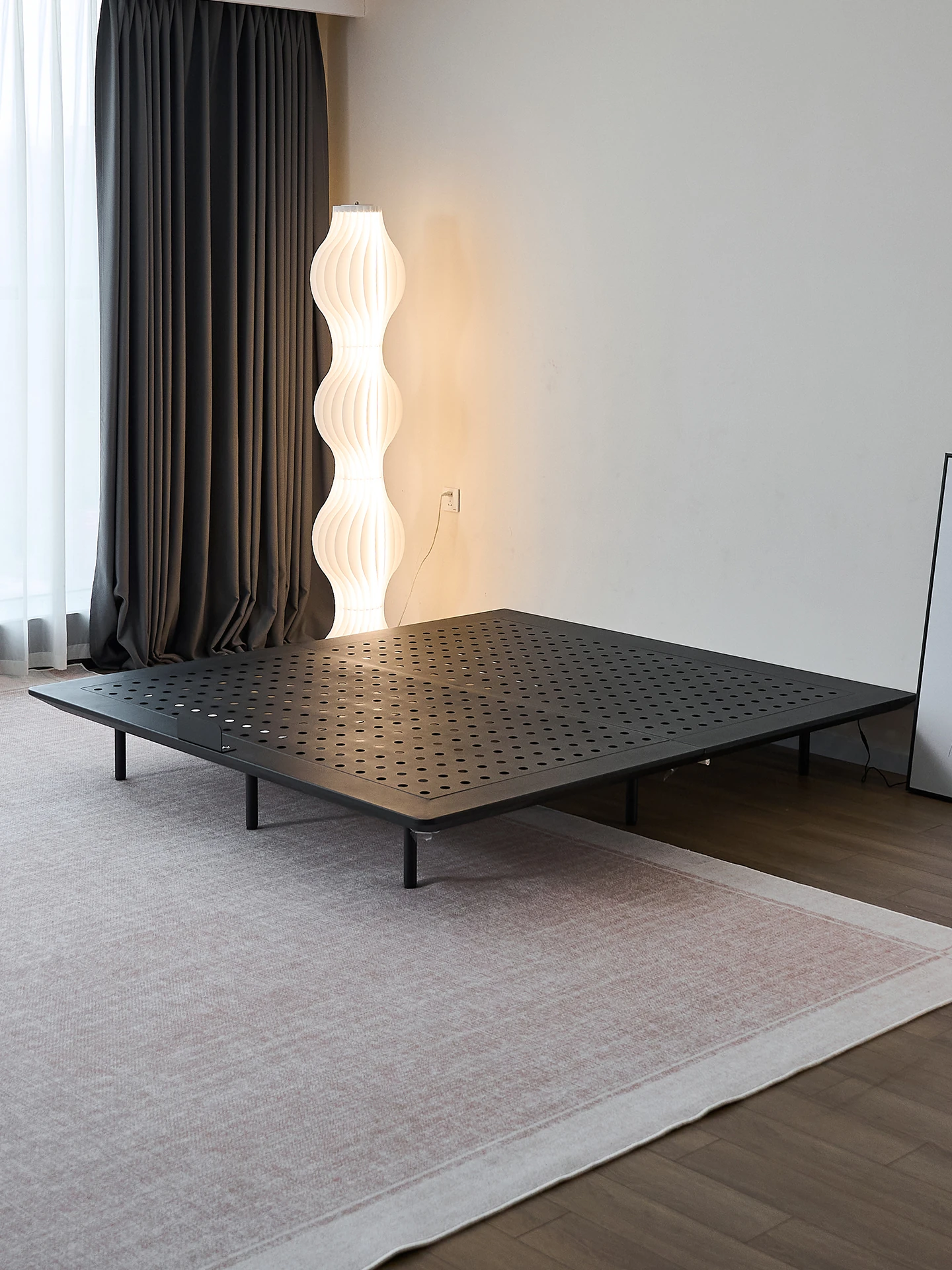 朴笙記のワッフルソフトパックアイアン製超薄ベッドカバー、バウハウススタイルのクリーム本革炭素鋼浮遊型小型婚礼ベッド。快適さとスタイルを兼ね備えた、あなたの特別な空間にぴったりのアイテムです!