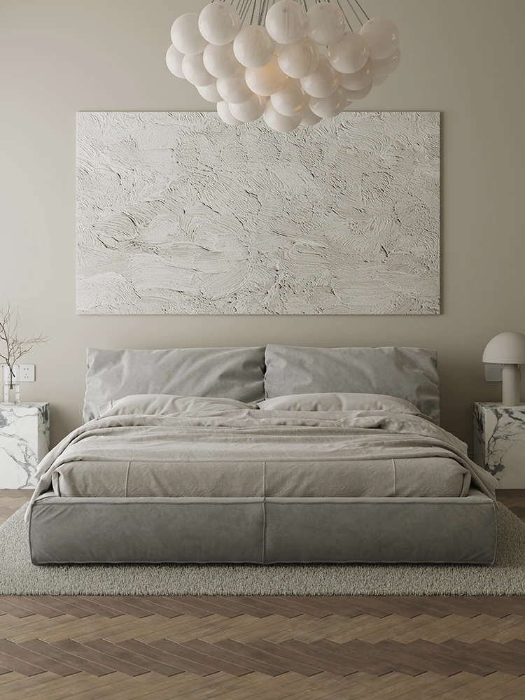 朴笙記の侘寂風デザイン、羊毛フリース布製モダンシンプル1.8mダブルベッド。ネットで話題の実木脚付き、ラグジュアリー感漂う主寝室にぴったり!