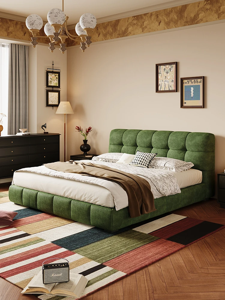 朴笙記の和風パフスイーツデザインの布製ベッド - 北欧スタイルの小型ルームにぴったり!エレガントな緑色と榉木収納付き、カップルに最適な婚礼ベッド。心地よい空間を演出します!