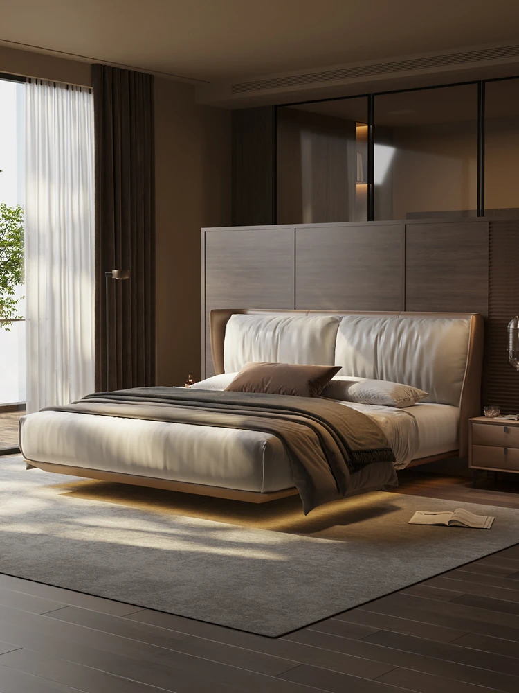 朴笙記の曲げ板本革ベッド - 現代的でシンプルな北欧イタリアンスタイルの主寝室用大婚ベッド、ブナのスラットフレームで快適な眠りを実現!