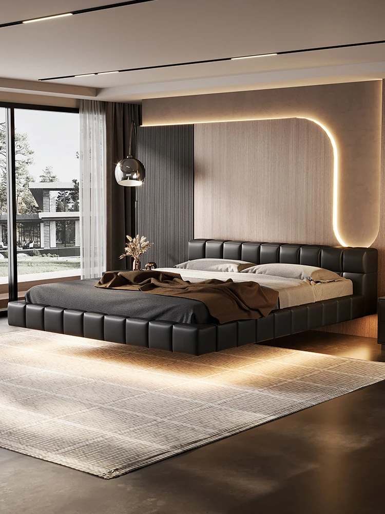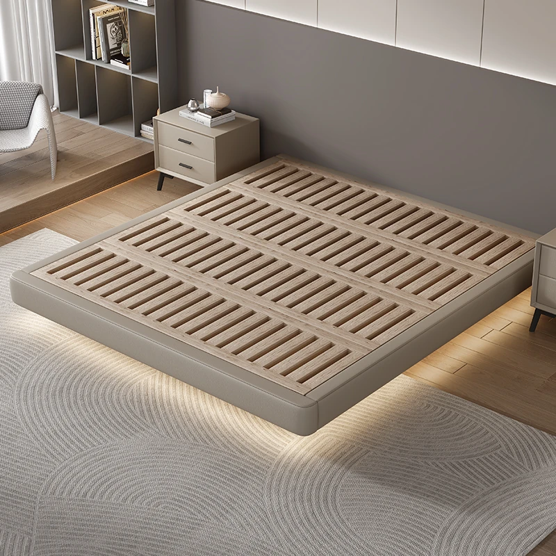 朴笙記のワッフルソフトパックアイアン製超薄ベッドカバー、バウハウススタイルのクリーム本革炭素鋼浮遊型小型婚礼ベッド。快適さとスタイルを兼ね備えた、あなたの特別な空間にぴったりのアイテムです!