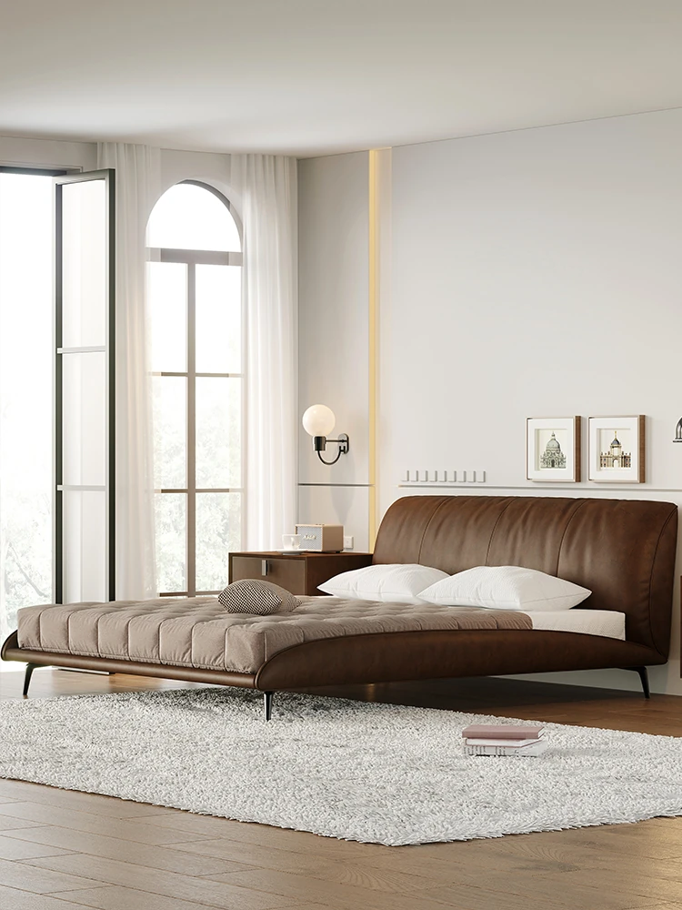 パクシン記チョコレート本革ベッド - シンプルでモダンなデザイン、小型住宅に最適なイタリアンミニマリズム、羽毛仕立てのデザイナーズチェック柄。快適さとスタイルを両立させた理想の寝室空間を演出します。