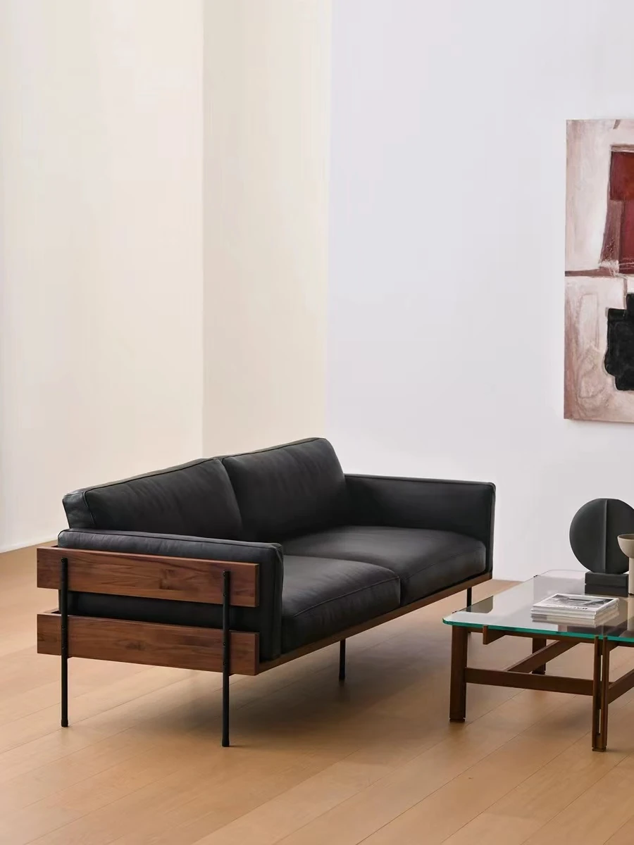 加減生活のマイスソファー - 中古風の本革リビング用新作、ブラックウォールナット無垢材使用の高背もたれ黒ソファ。スタイリッシュで快適、あなたのリビングにぴったり!